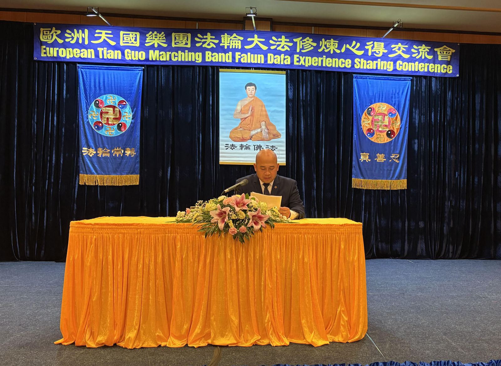 修煉心得交流會由兩位樂團成員主持。他們致開幕詞時說:「作為天國樂團的一員,我們不僅用音樂在證實法、救度眾生,同時在這個過程中也在不斷地修煉自己──放下執著、提高心性、相互配合、形成整體。」