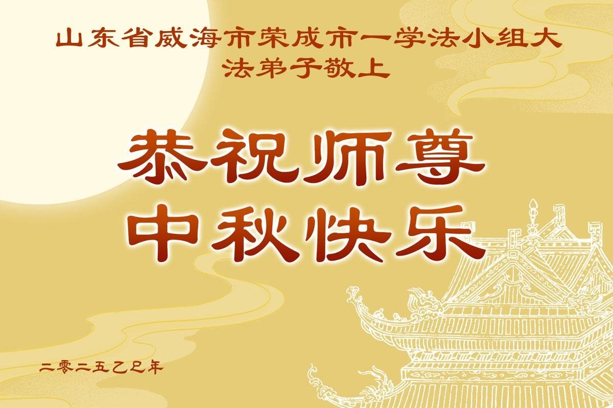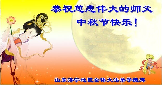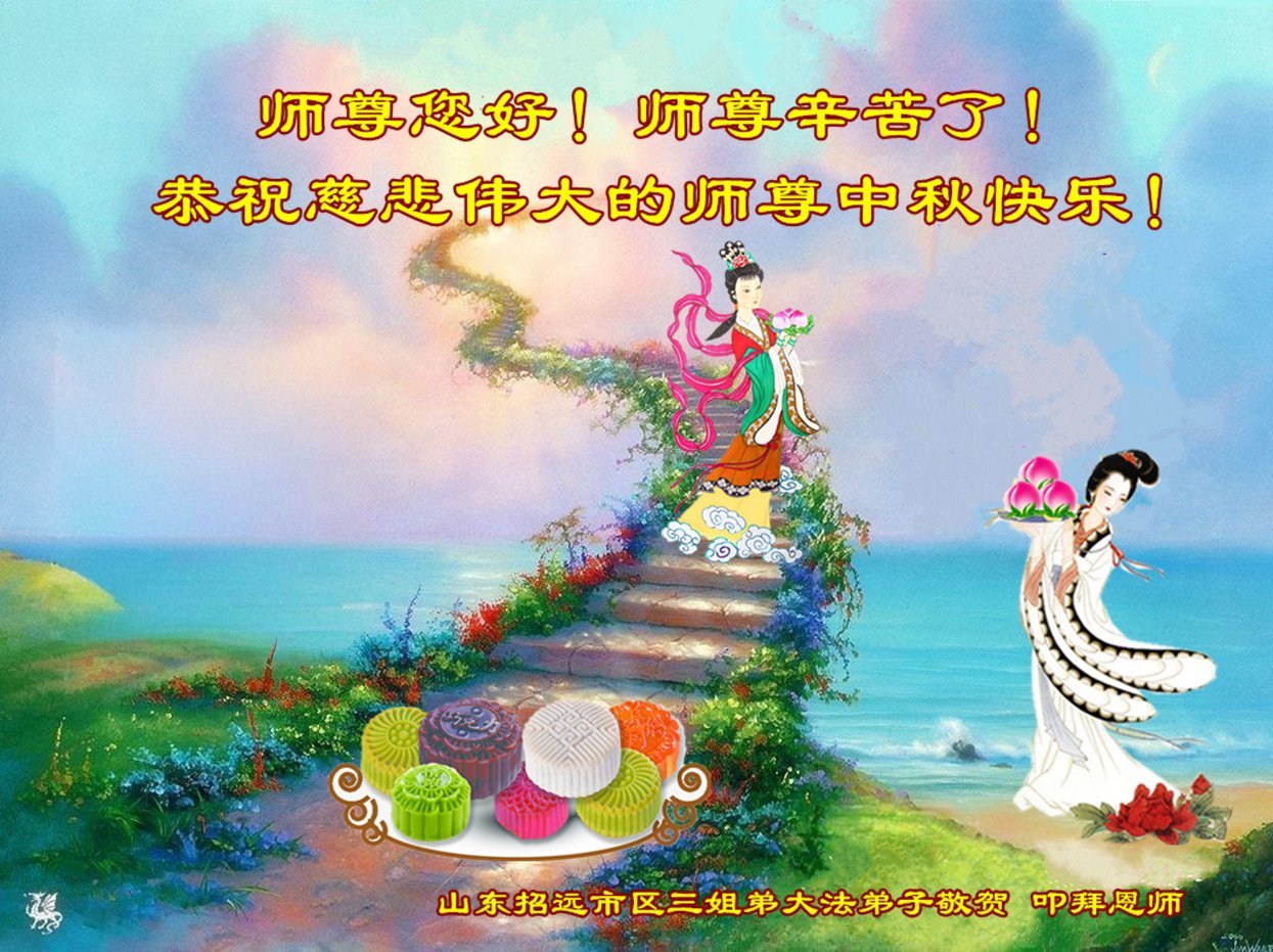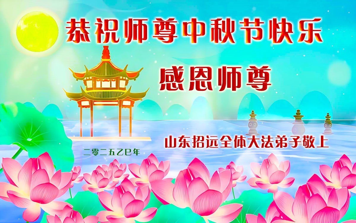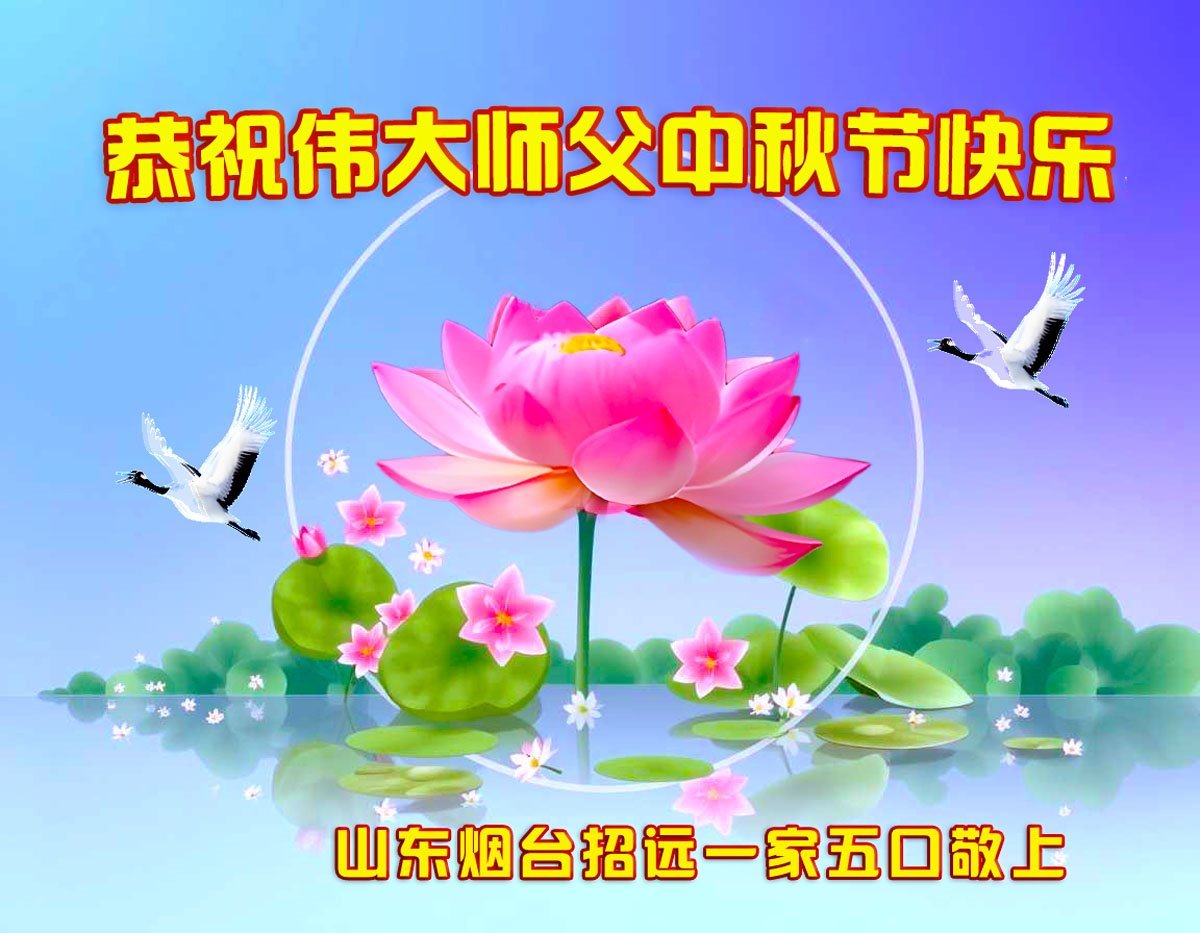 每逢佳節,弟子們無不想念偉大慈悲的師尊,我們盼望在中土和師尊一起過團圓節!現在雖然我們與師尊相隔萬里,但我們知道師尊時刻守護在我們身邊。我們相信,與師尊團圓的日子很快就要到來!光明就在眼前!我們招遠全體大法弟子將在師尊引領下,精進實修,努力做好三件事,學好法,同化法,加大力度發正念,清除邪惡爛鬼,多救人,兌現誓約,迎師尊回國,不再讓師尊為我們拖延結束時間而承受巨大痛苦。謝謝師尊的慈悲保護,我們跪拜師尊,恭祝師尊中秋節快樂!