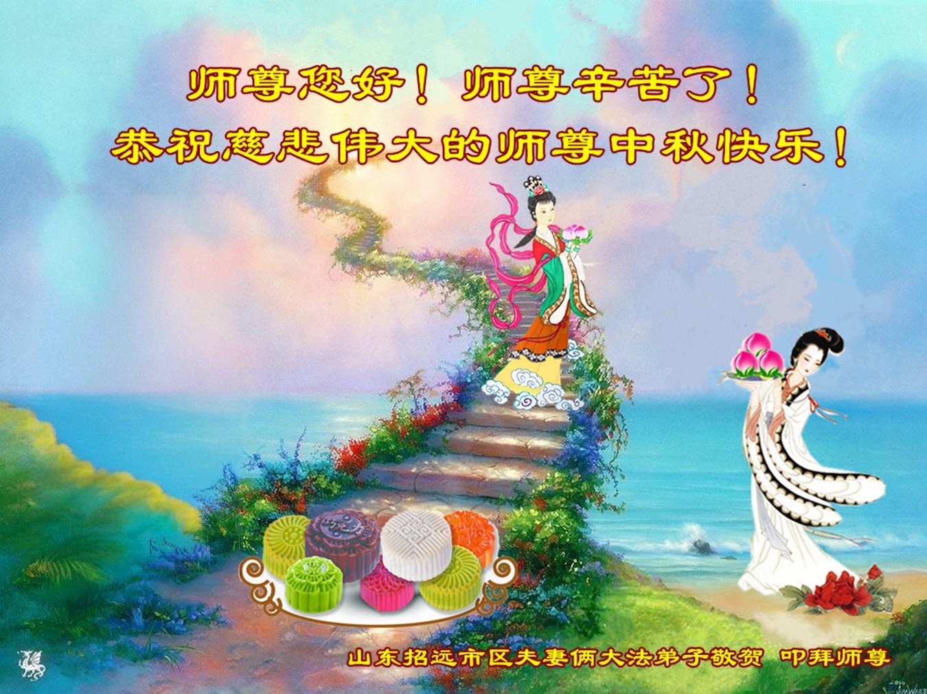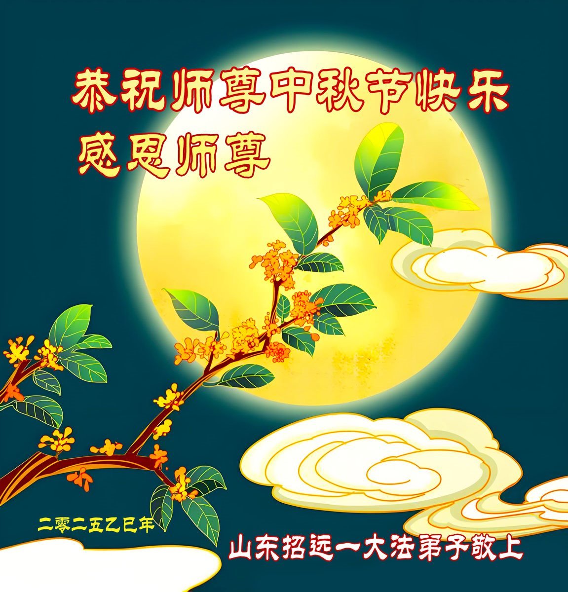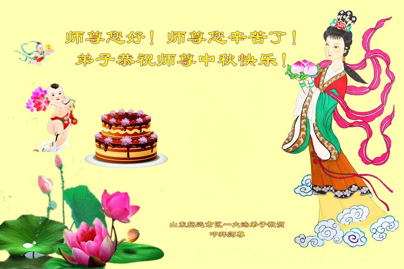 每逢佳節,弟子們無不想念偉大慈悲的師尊,我們盼望在中土和師尊一起過團圓節!現在雖然我們與師尊相隔萬里,但我們知道師尊時刻守護在我們身邊。我們相信,與師尊團圓的日子很快就要到來!光明就在眼前!我們招遠全體大法弟子將在師尊引領下,精進實修,努力做好三件事,學好法,同化法,加大力度發正念,清除邪惡爛鬼,多救人,兌現誓約,迎師尊回國,不再讓師尊為我們拖延結束時間而承受巨大痛苦。謝謝師尊的慈悲保護,我們跪拜師尊,恭祝師尊中秋節快樂!