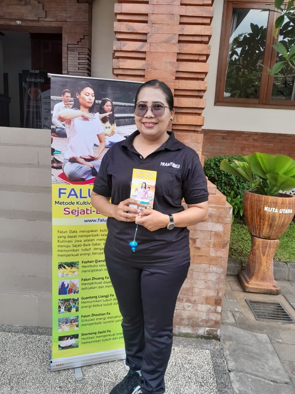 北庫塔區政府秘書普圖﹒拉克斯米﹒德維(Putu Laksmi Dewi)熱情歡迎法輪功學員教區政府工作人員學煉功法。活動結束後,她感謝學員們免費教功。