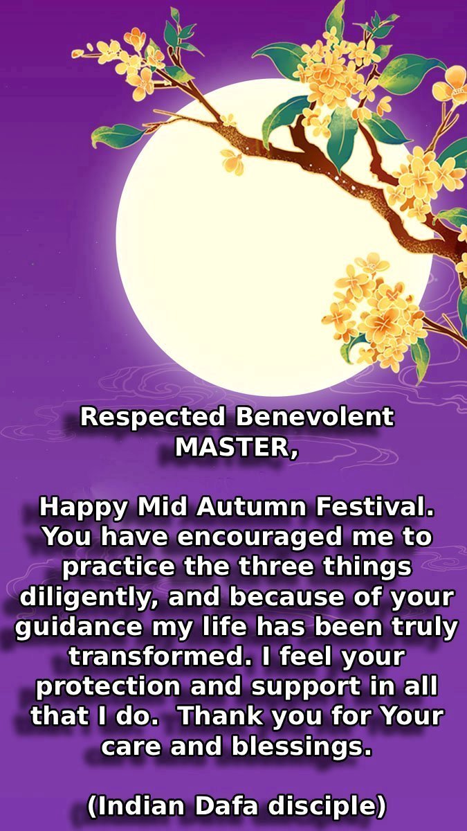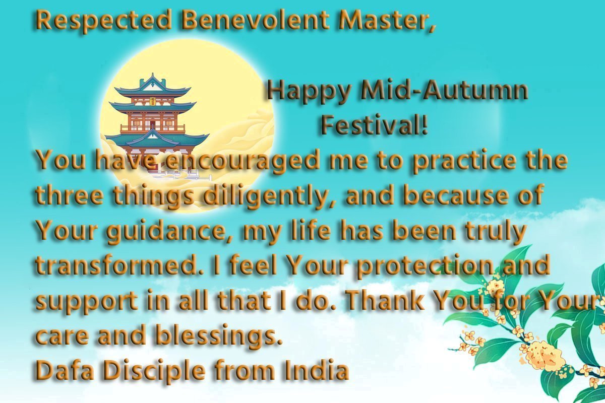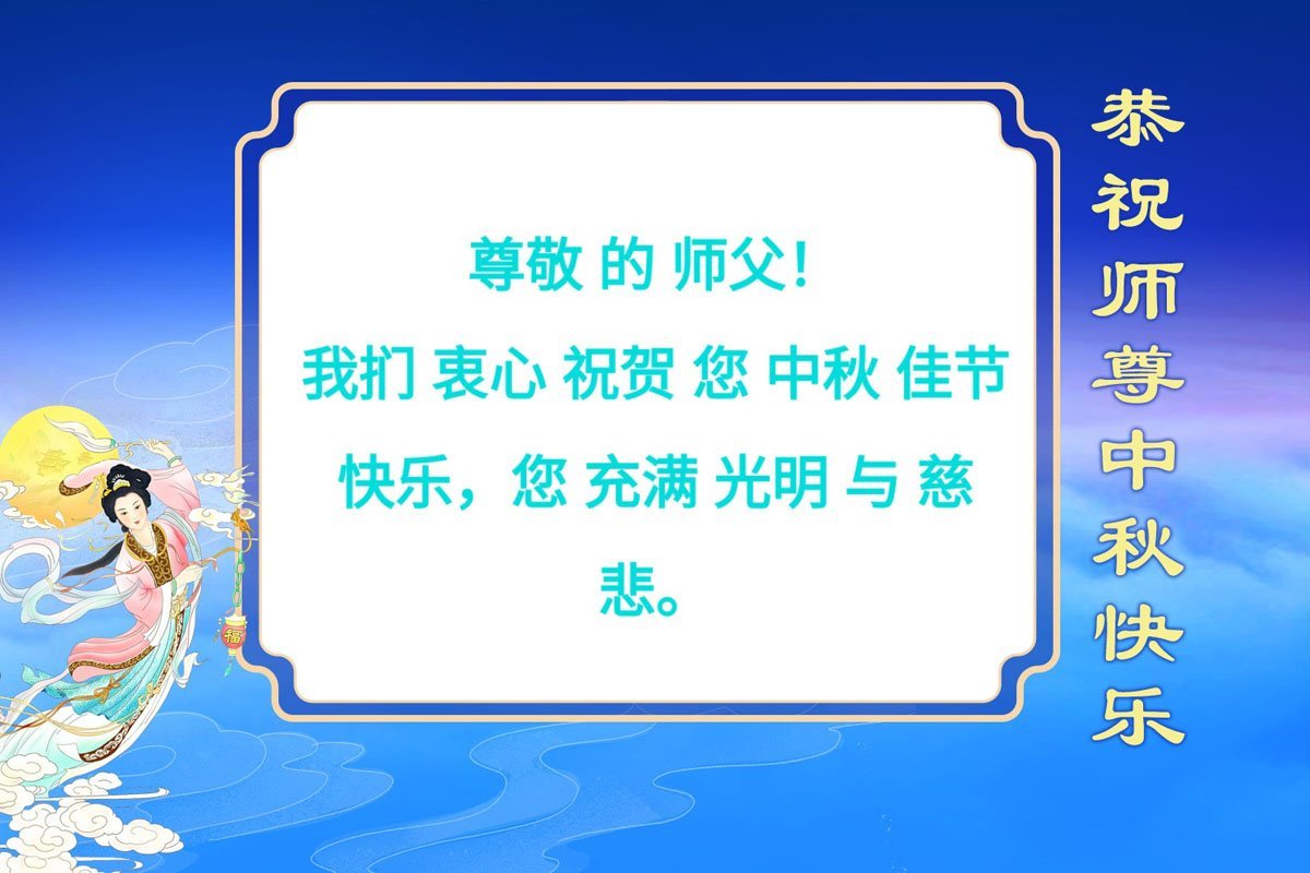 (尊敬的慈悲的師父:祝您中秋節快樂!您鼓勵我精進修煉做三件事,在您的指導下,我的人生發生了翻天覆地的變化。我所做的一切都感受到您的守護和支持。感謝您的看護與祝願。)