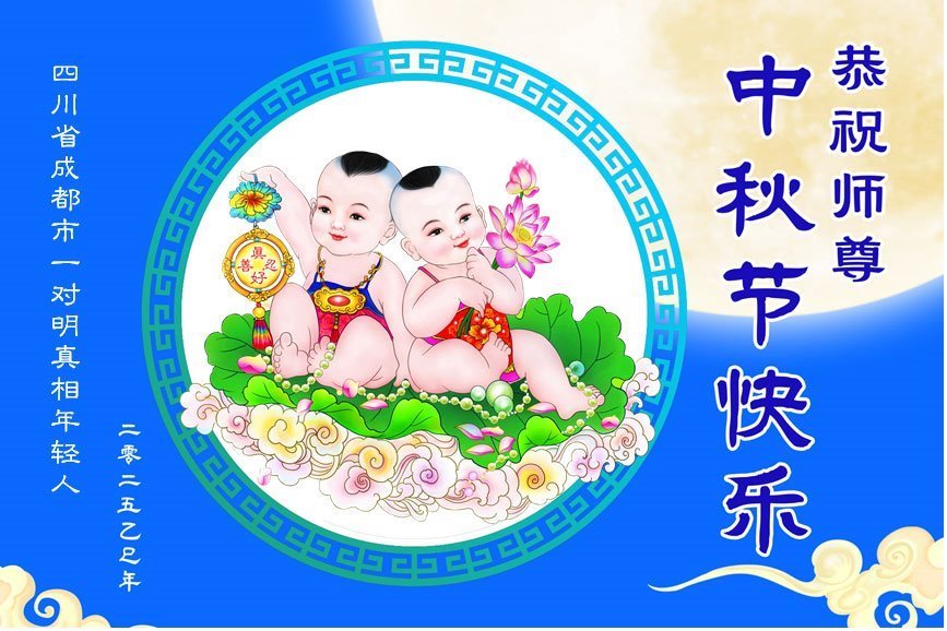四川省成都市一對明真相年輕人恭祝大法師父中秋節好!