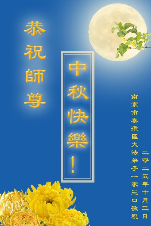弟子全家恭祝師尊中秋節快樂!感恩師尊慈悲苦度。弟子唯有精進實修,做好三件事,跟上正法進程,不辜負慈悲偉大的師尊的期望。弟子全家叩拜師尊。