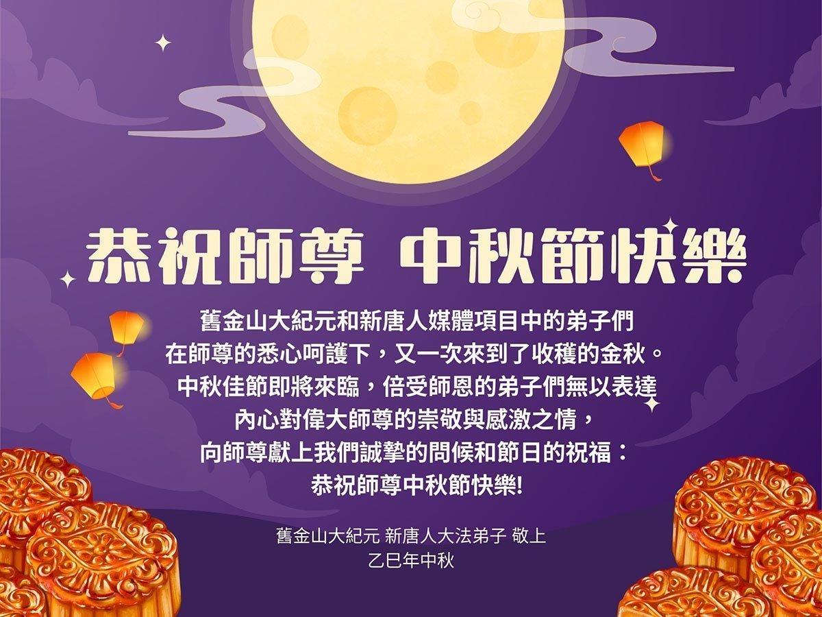 舊金山大紀元和新唐人媒體項目中的弟子們在師尊的悉心保護下,又一次來到了收穫的金秋。中秋佳節即將來臨,備受師恩的弟子們無以表達內心對偉大師尊深深的感恩,向師尊獻上我們最誠摯的中秋祝願。