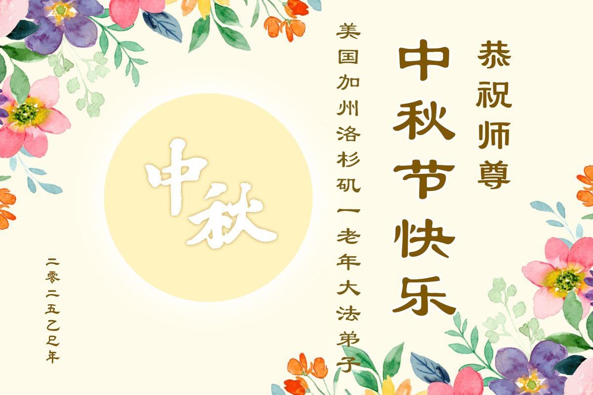 美國加州洛杉磯一老年大法弟子恭祝師尊中秋節快樂!
