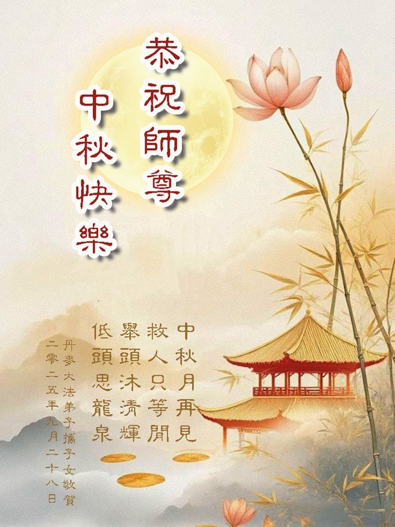 恭祝慈悲偉大的師父中秋節快樂!祝願全體大法弟子在修煉中堅守誓言,助師救度眾生,隨師父一起回歸真正的家園。(譯文)