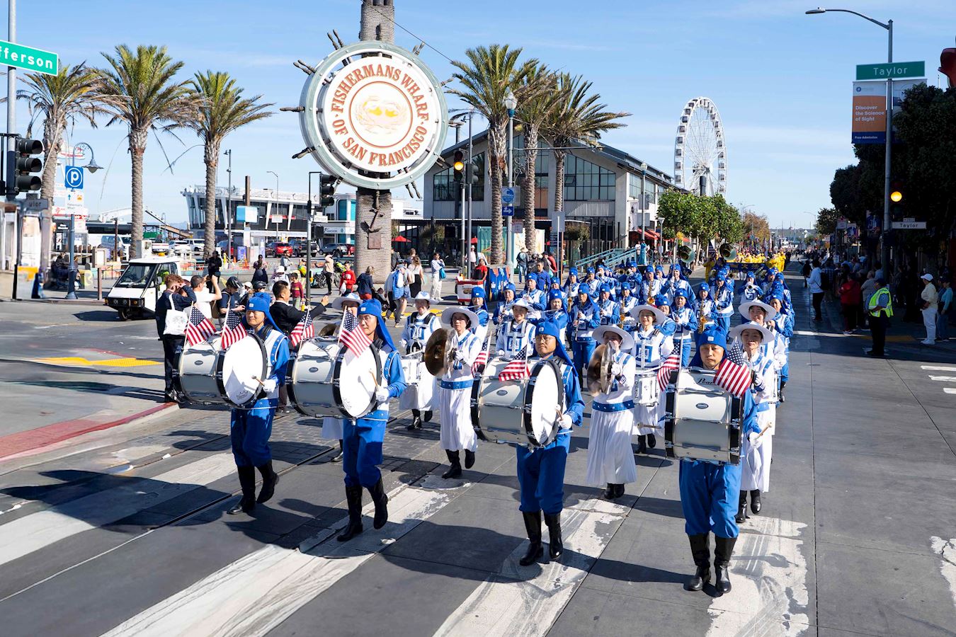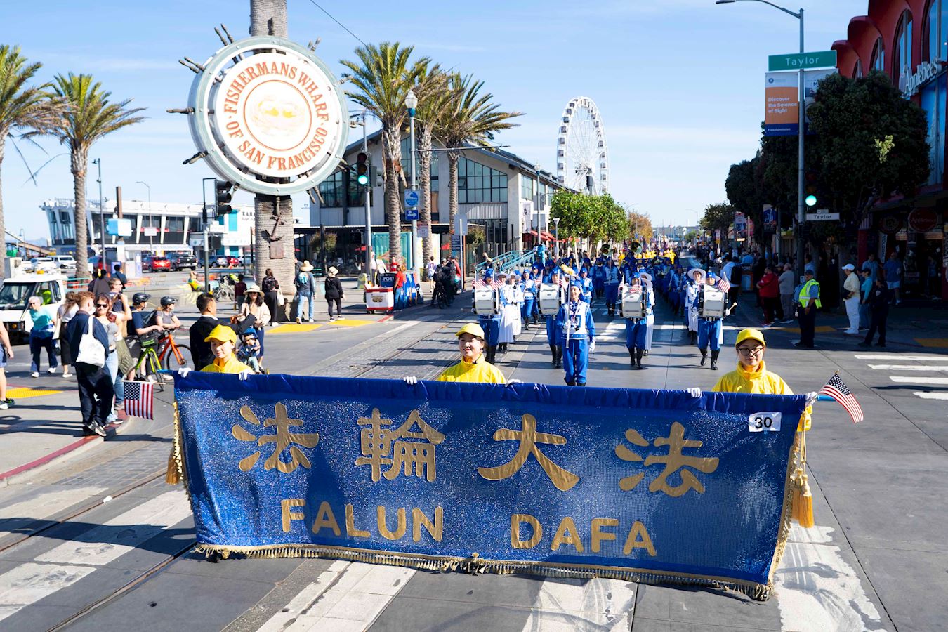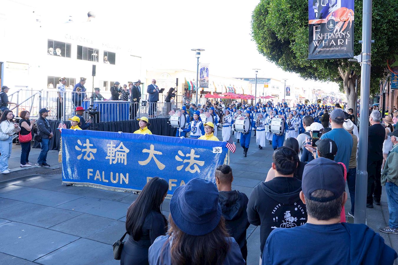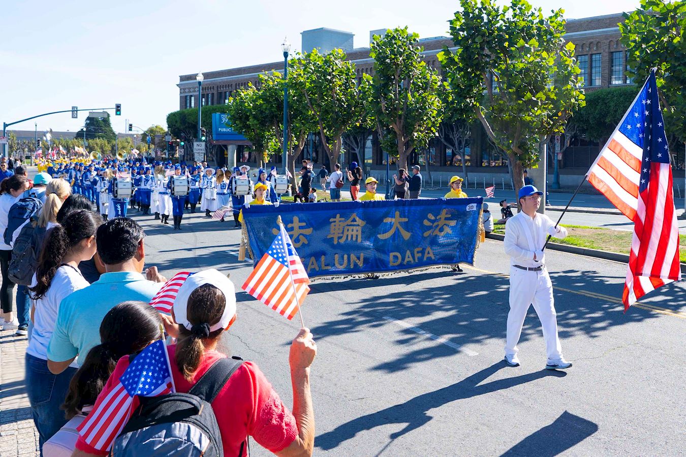 法輪功學員的隊伍由美西天國樂團和煉功隊組成。天國樂團為觀眾帶來了《法輪大法好》和《美國國歌》等樂曲,受到觀眾的歡迎。法輪功學員的功法演示讓觀眾感到放鬆,心情愉悅。