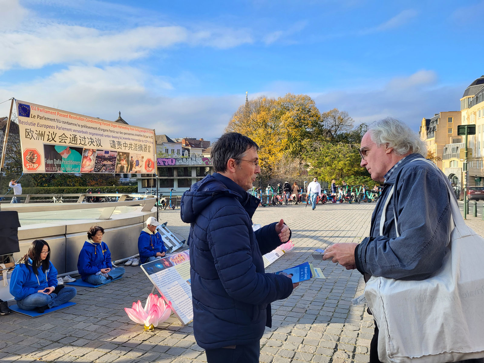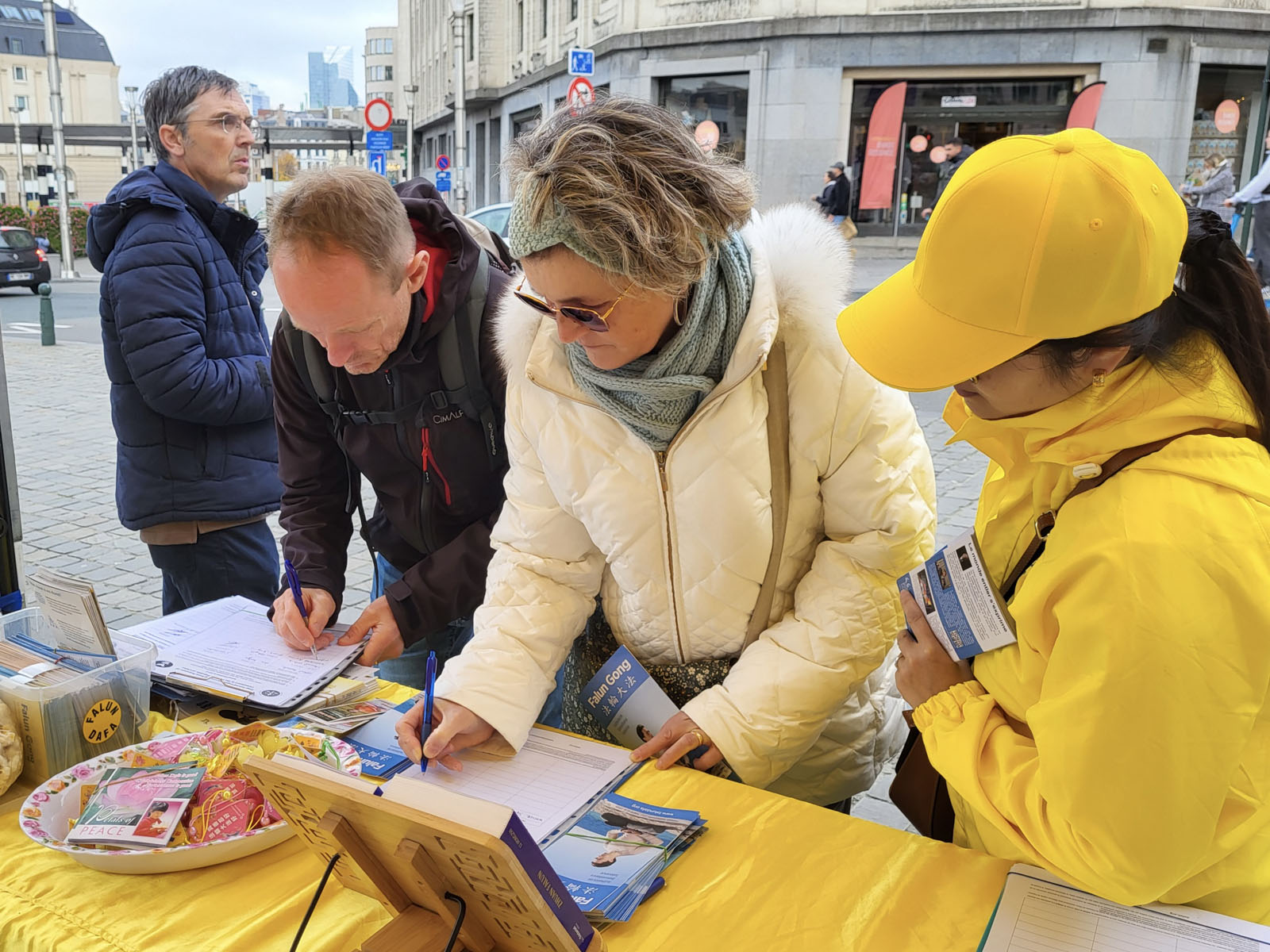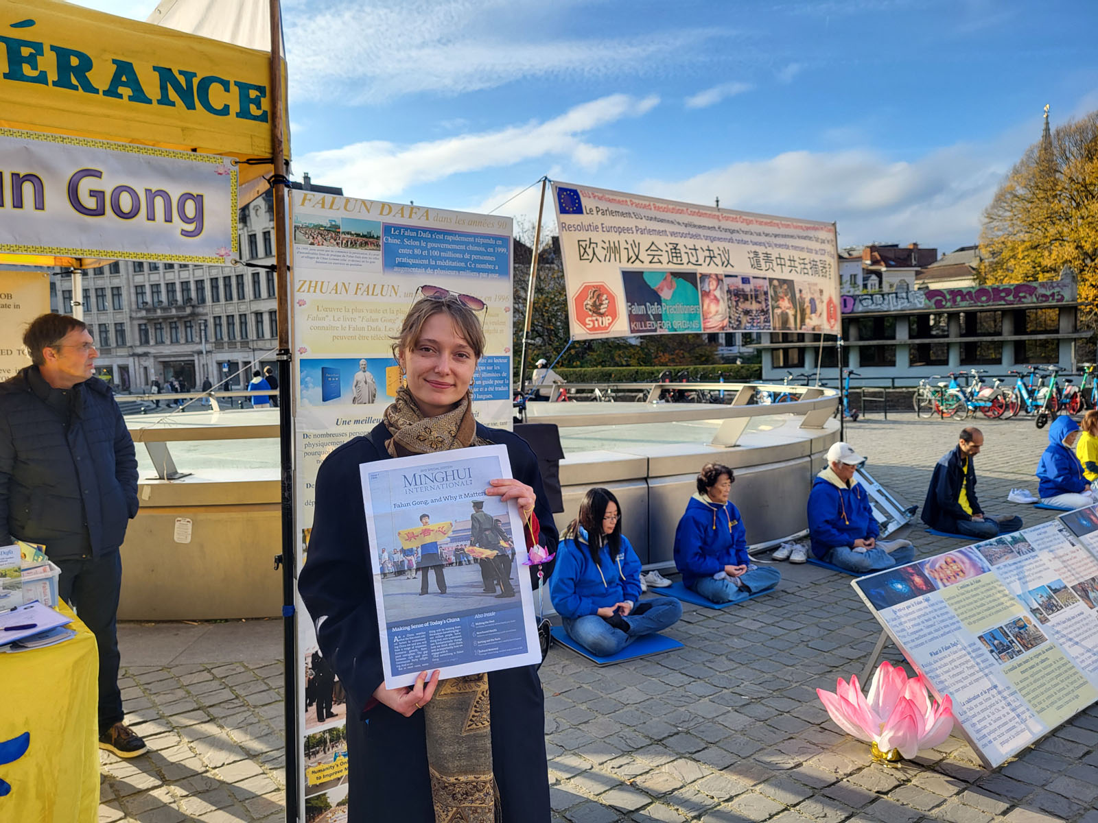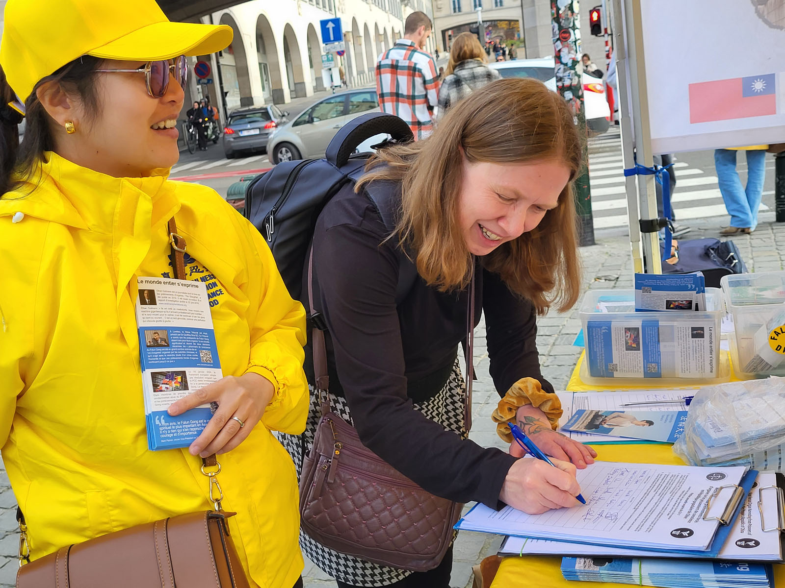 在法國文化與國際交流協會工作的瑪琳(Marine)與學員交談許久。她非常希望了解法輪功及發生的迫害。她和朋友週末來比利時度假,他們第一次得知這場迫害,當讀了橫幅和展板上寫的中共迫害法輪功的訊息,瑪琳覺得自己應該做點甚麼,哪怕只是簽名支持。她說,讓更多的人來了解發生的迫害是非常重要,「我的工作關係我希望了解更多的訊息,能讓更多的人來參與反迫害簽名。」