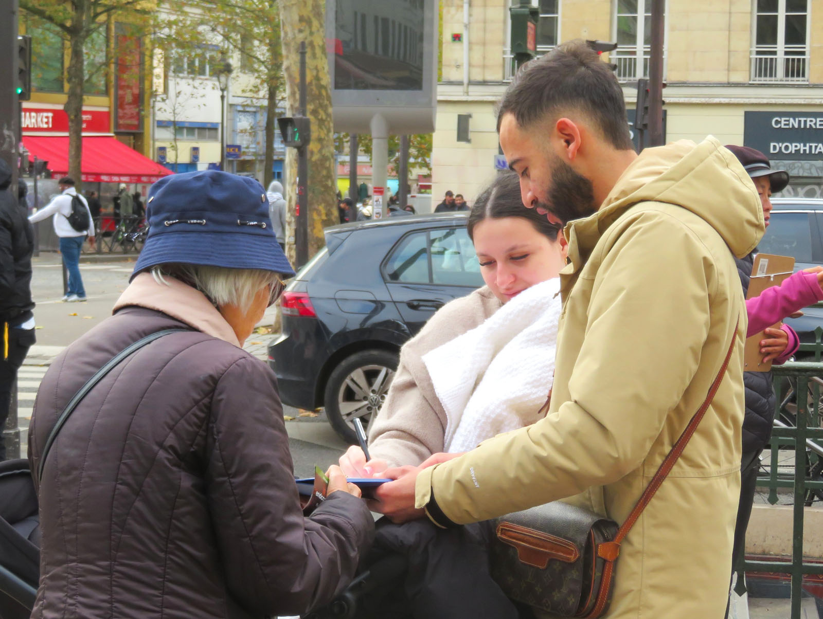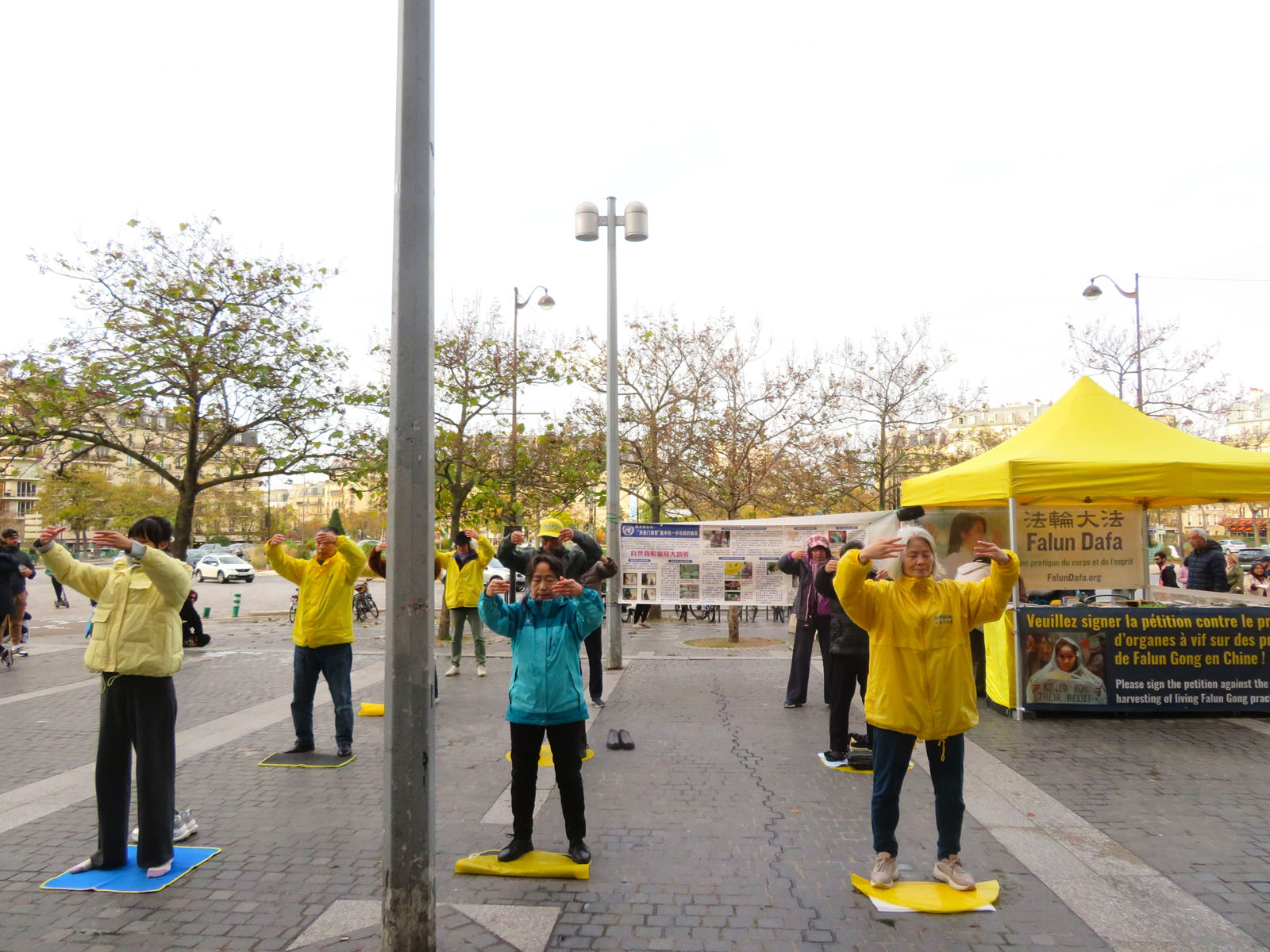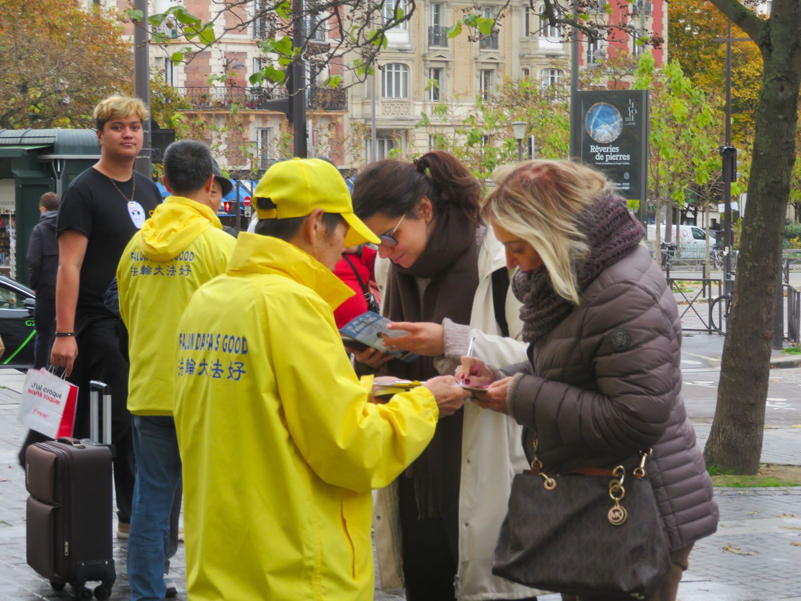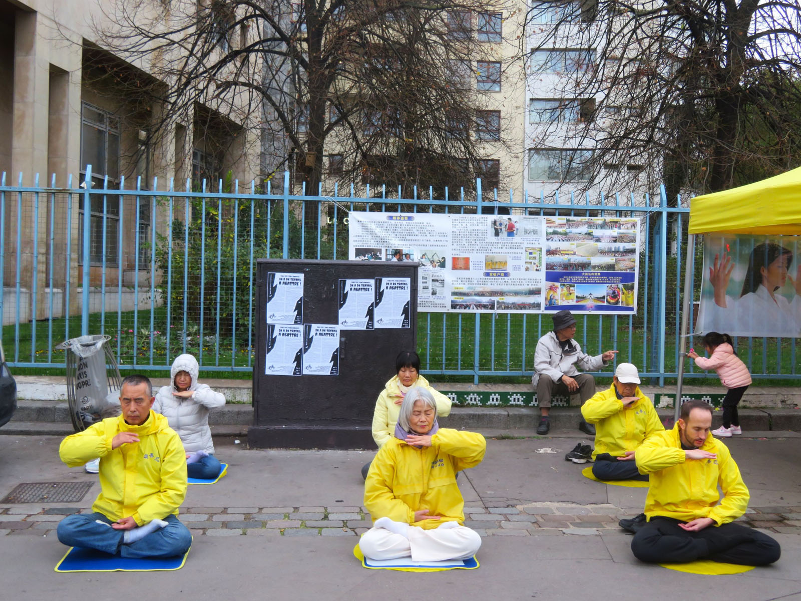 十一月十一日這天是公假日,法輪功學員再次來到巴黎美麗城,伴隨著祥和的煉功音樂,他們展示法輪功五套功法,向過往民眾講述法輪功真相,彷彿給這個街區注入了新鮮的空氣。人們主動在反迫害徵簽表上簽字,多位華人在法輪功學員的幫助下退出了中共黨、團、隊組織。