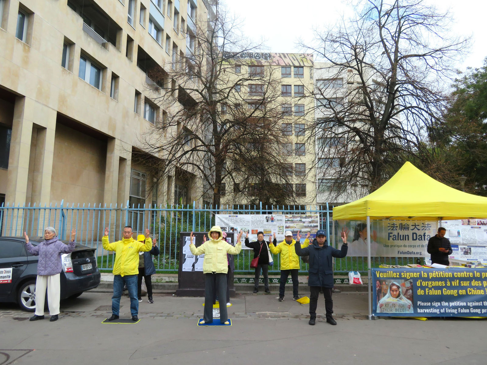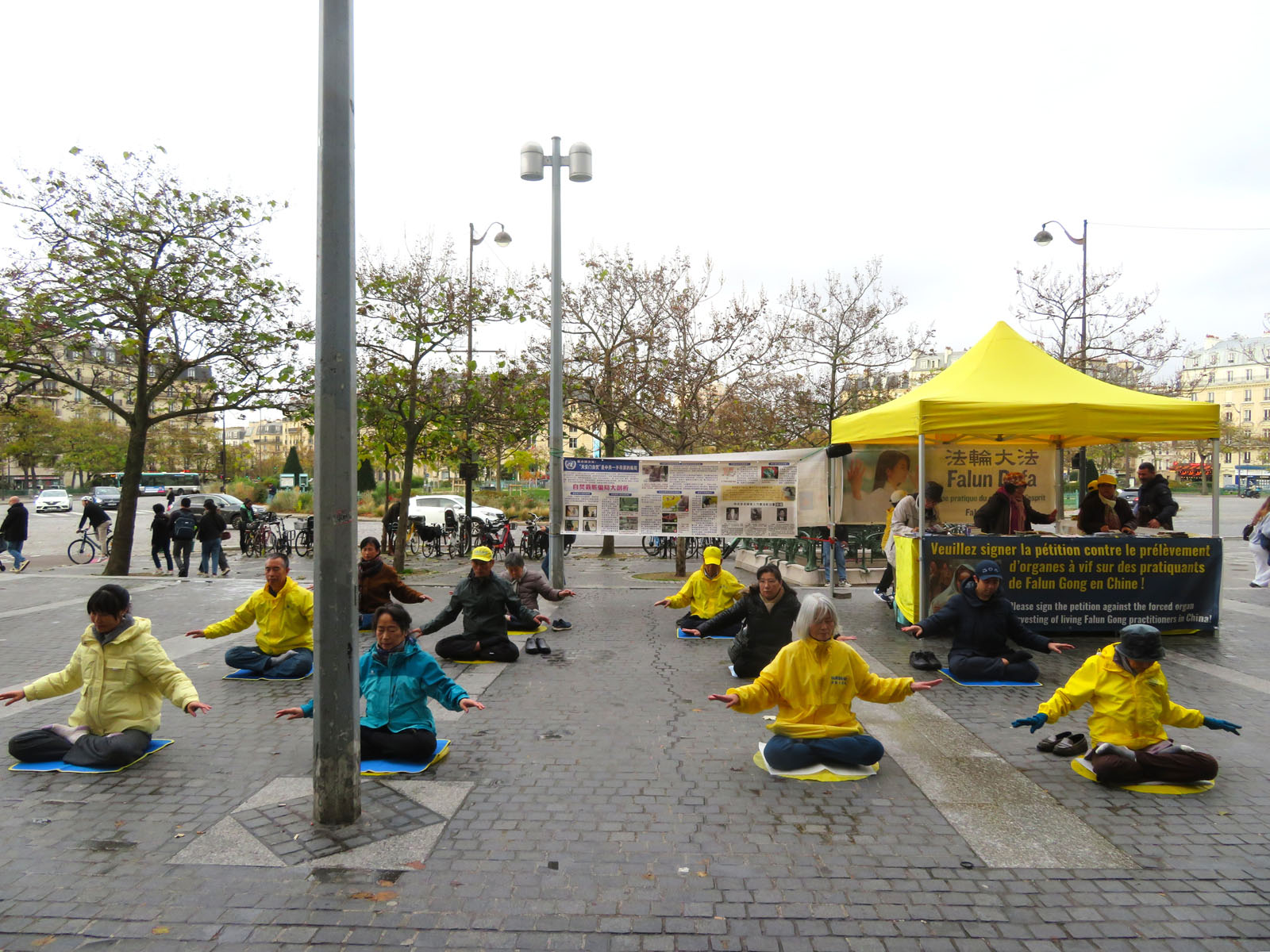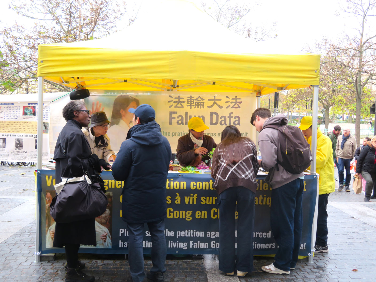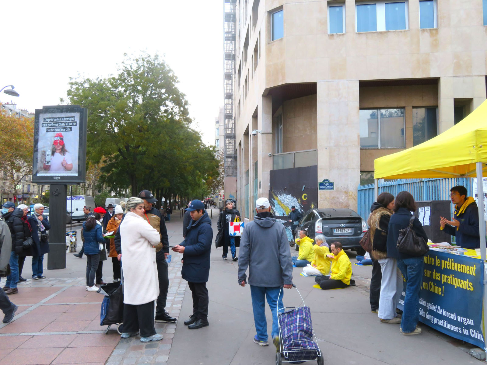 十一月十一日這天是公假日,法輪功學員再次來到巴黎美麗城,伴隨著祥和的煉功音樂,他們展示法輪功五套功法,向過往民眾講述法輪功真相,彷彿給這個街區注入了新鮮的空氣。人們主動在反迫害徵簽表上簽字,多位華人在法輪功學員的幫助下退出了中共黨、團、隊組織。