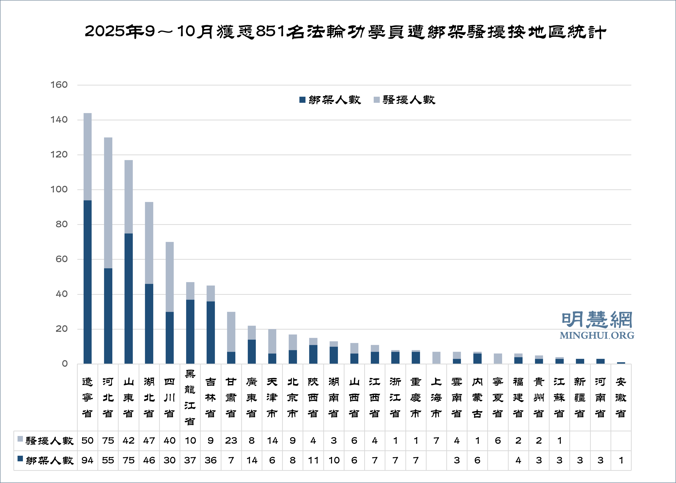 ![]() 圖1:2025年9~10月獲悉851名法輪功學員遭綁架騷擾按地區統計 |