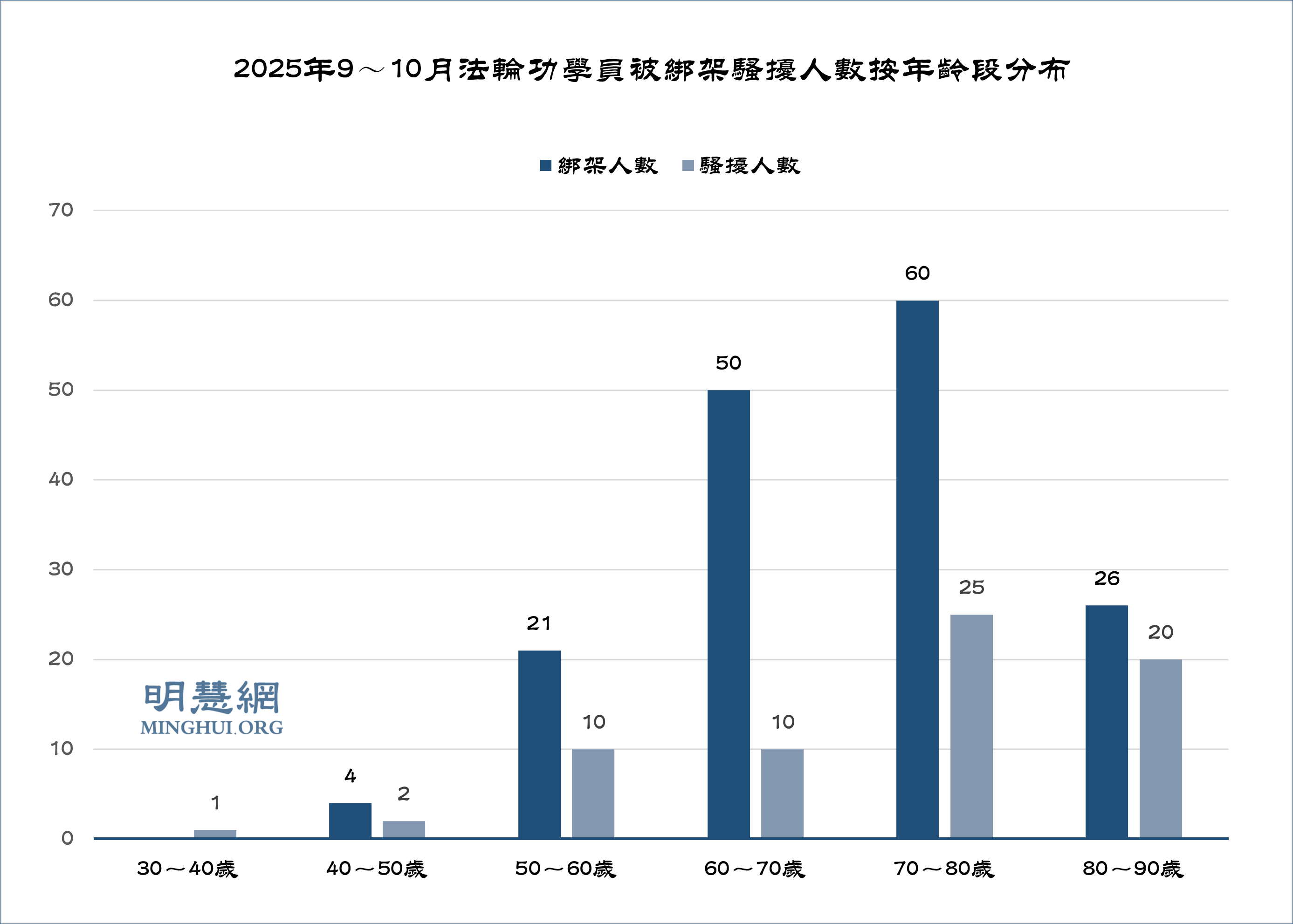 ![]() 圖2:2025年9~10月法輪功學員被綁架騷擾人數按年齡段分布(僅限於對已知年齡的法輪功學員人數統計) |