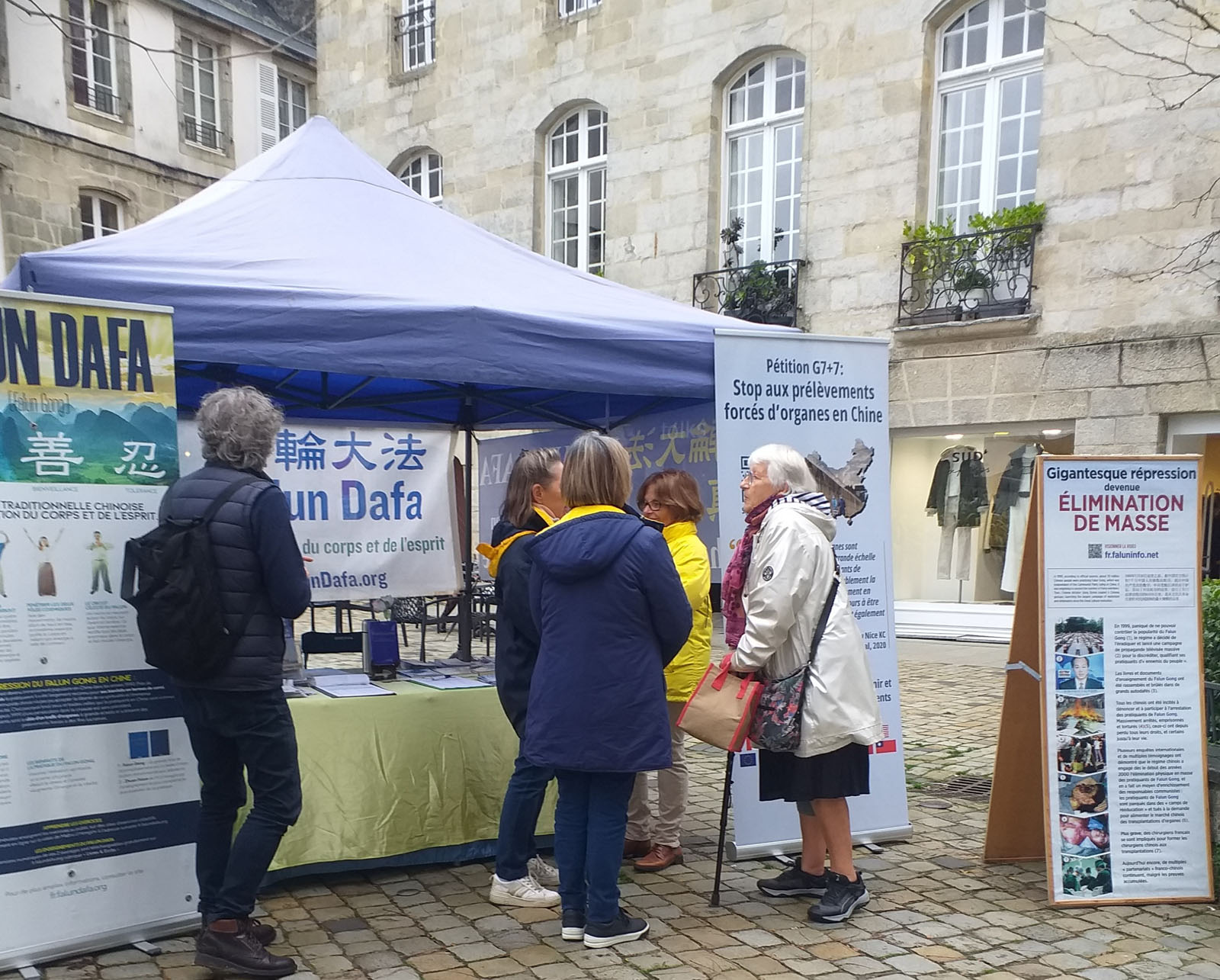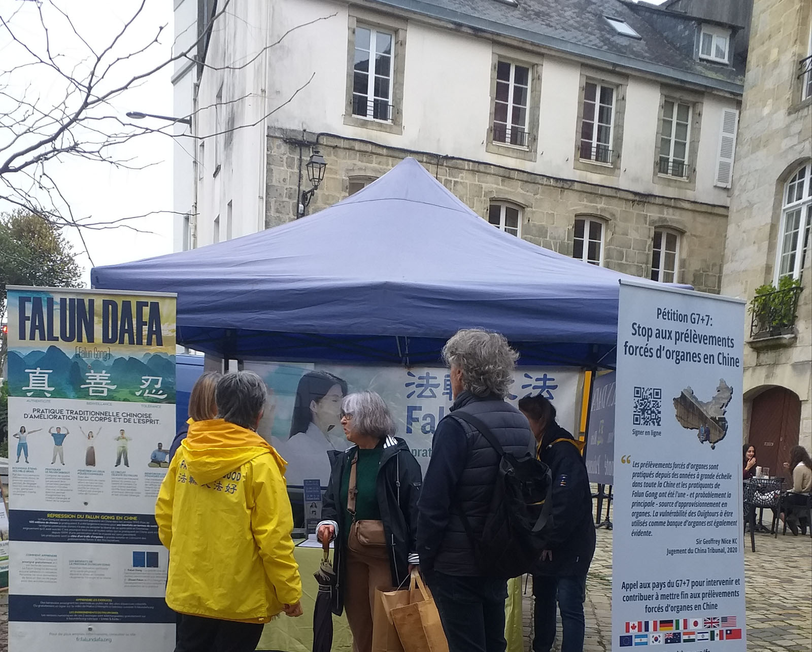 一位坎佩爾的居民夫婦接過了關於活體摘取器官的傳單。先生是從事ISO(國際標準化組織)工作,他希望在網上進一步了解法輪功以及中共對法輪功學員的迫害。他也表示目前充斥很多虛假的信息,臨走前也拿了明慧網關於法輪功的《明慧二十年報告》,準備傳播出去。