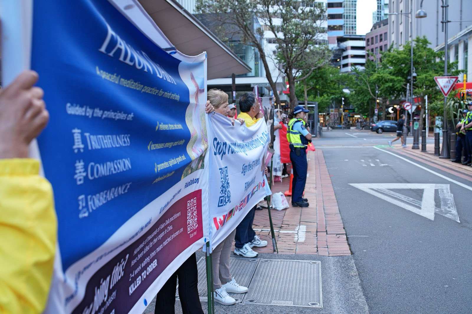 學員們在現場安靜和平、向路人和媒體遞送真相資料,並向新西蘭政府表達訴求,希望政府能夠關注中共迫害法輪功真相,並依據《馬格尼茨基法案》等國際人權機制,對參與迫害的中國官員實施入境限制和凍結資產等制裁措施。他們表示,新西蘭作為重視法治與人權的國家,應該在國際社會中發揮道義影響力,為制止迫害發聲。