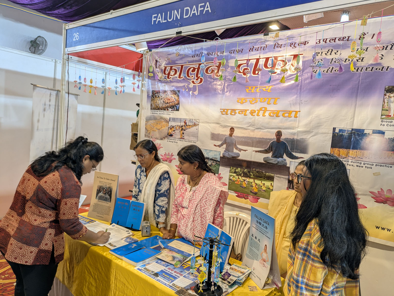 在展位上,法輪功學員展示了《法輪功》和《轉法輪》這兩本法輪大法的主要著作,包括印地語、英語和當地語言馬拉地語三個語種的書籍。學員們還講述了法輪大法在中國遭受中共的迫害,包括任意監禁、酷刑折磨,甚至活摘法輪功學員的器官。