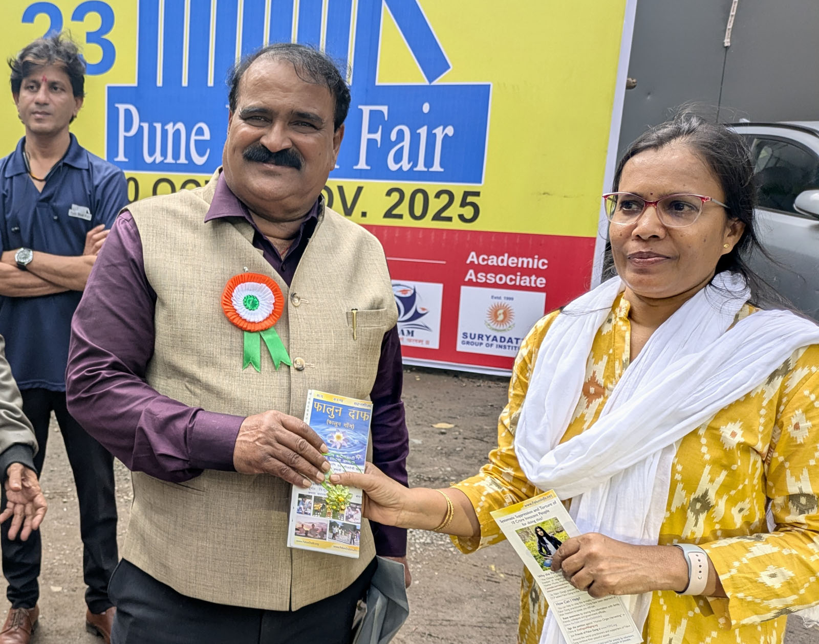 在開幕式上,法輪功學員有機會向書展主要賓客維什瓦斯﹒帕蒂爾先生(Mr. Vishwas Patil )介紹法輪大法。帕蒂爾先生是一位著名的馬拉地語作家,也是一位前印度行政服務官員。學員們向他簡要介紹了法輪大法,並贈送給他一些法輪大法資料。