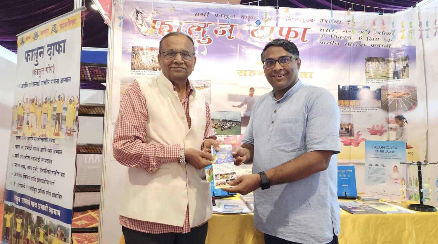 活動首日,退休助理警務專員維納亞克拉夫﹒賈達夫( Vinayakrav Jadhav)先生來到展位前,他對法輪大法表現出濃厚的興趣。他對學員表示讚賞:「這一修煉方法非常好。我想閱讀法輪大法的兩本主要著作,我們也需要將這一修煉方法介紹給我的退休警務同事們。你們做得非常好,我們希望能把這一修煉方法介紹給我們的退休警務人員。」
