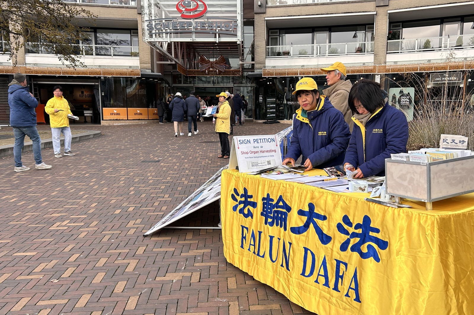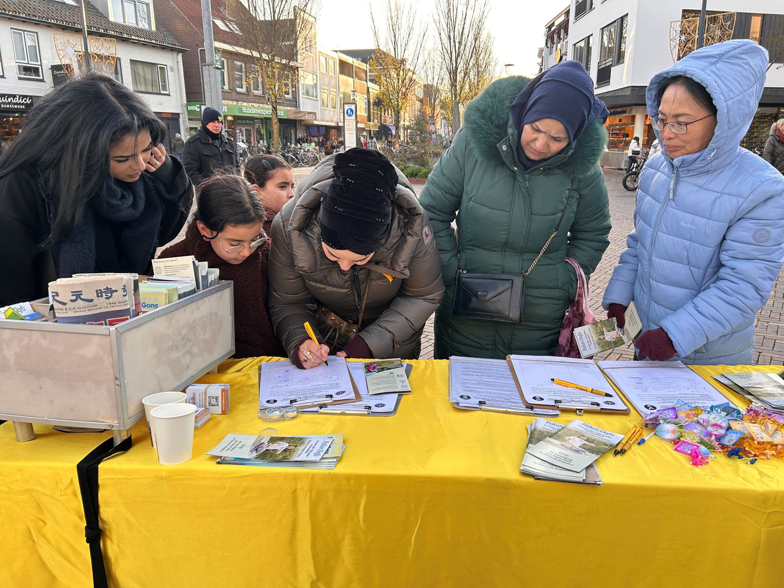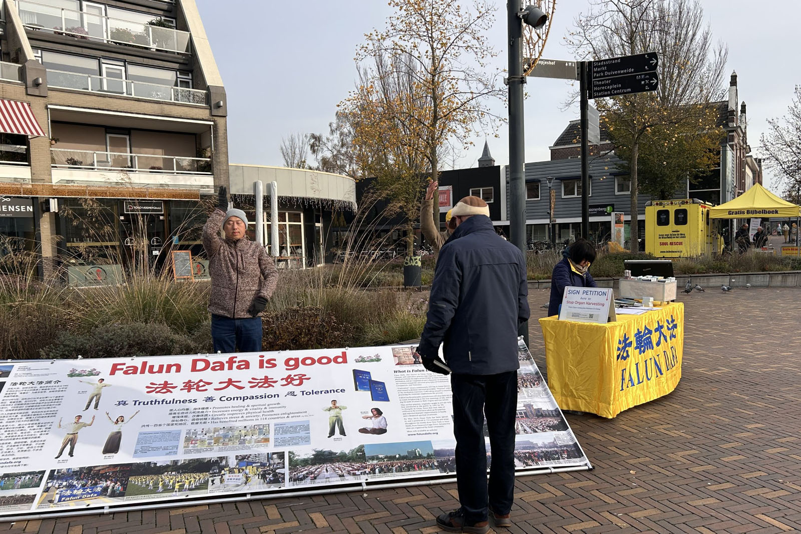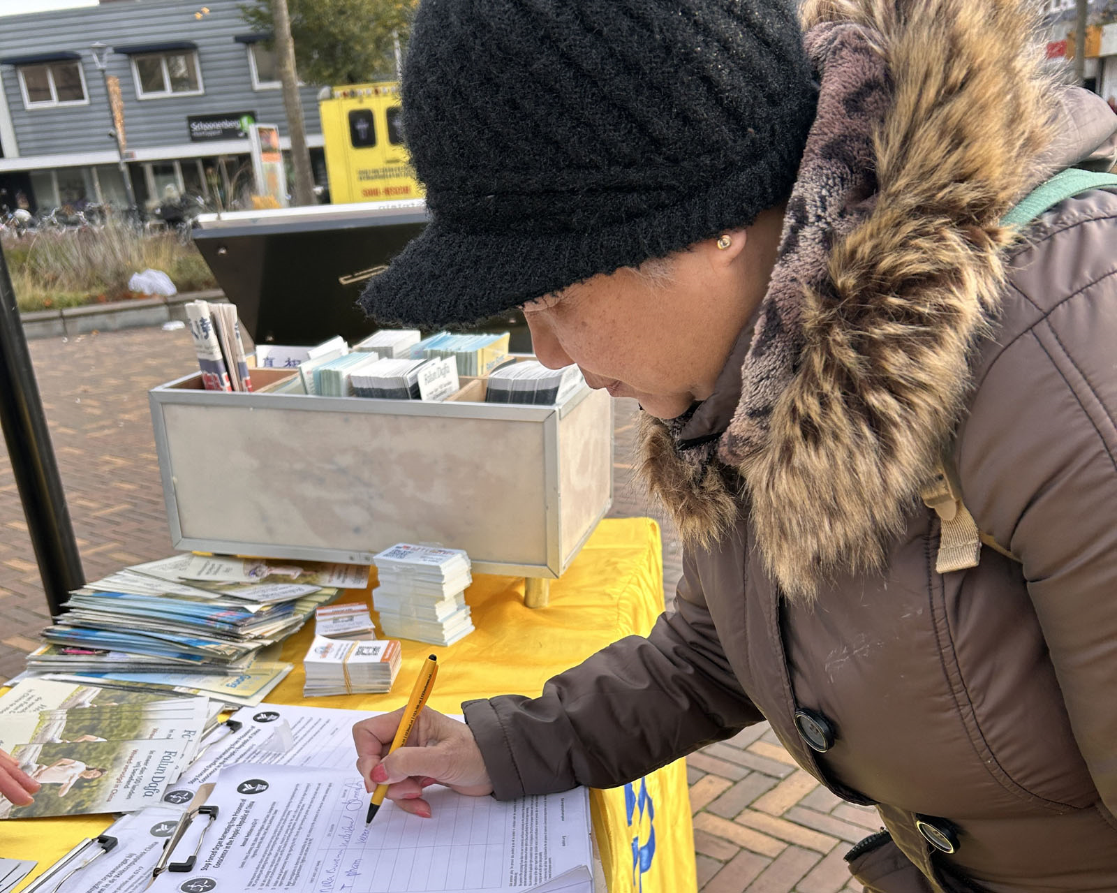 二十二日中午,法輪功學員們在費嫩達爾的高街(Hoogstraat)布置法輪功真相展板,演示法輪功五套功法,向路人發送傳單,講述法輪功在中國遭遇中共長達二十六年的迫害。人們在反對中共活摘法輪功學員器官的徵簽表上簽名,支持法輪功反迫害。