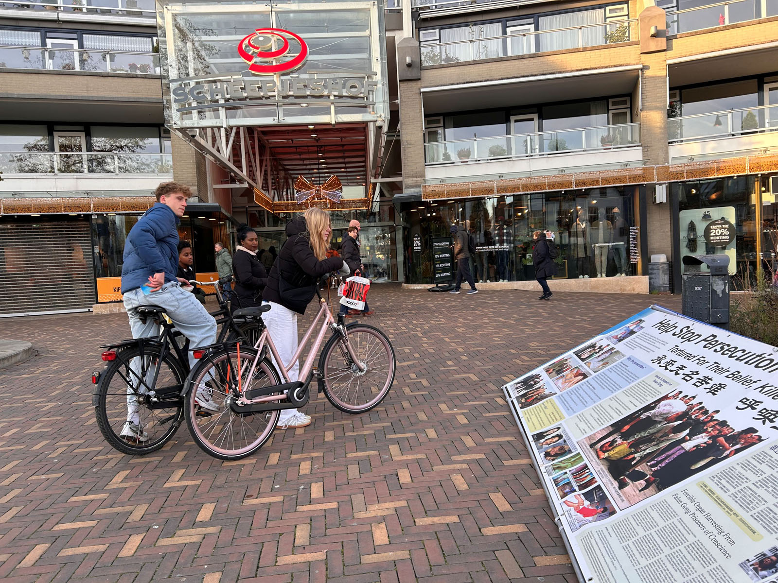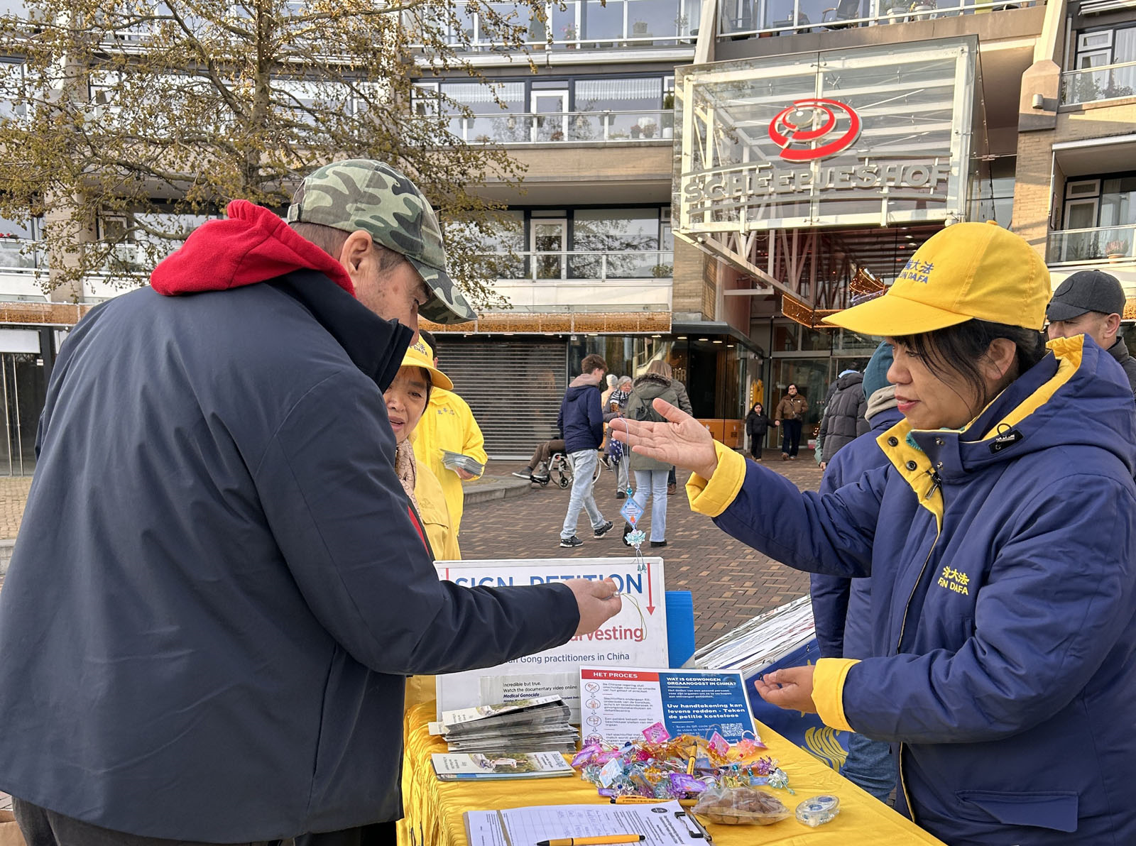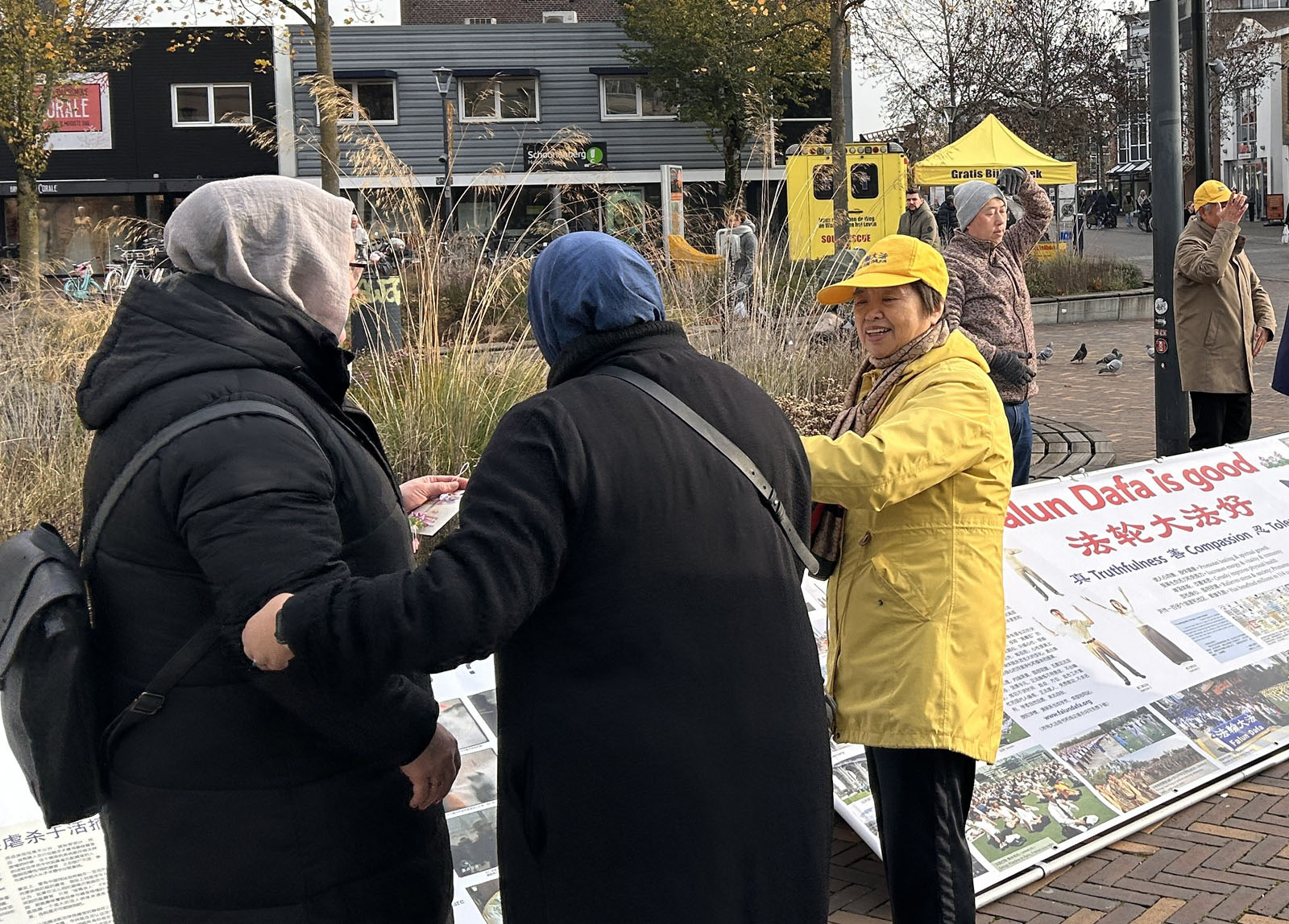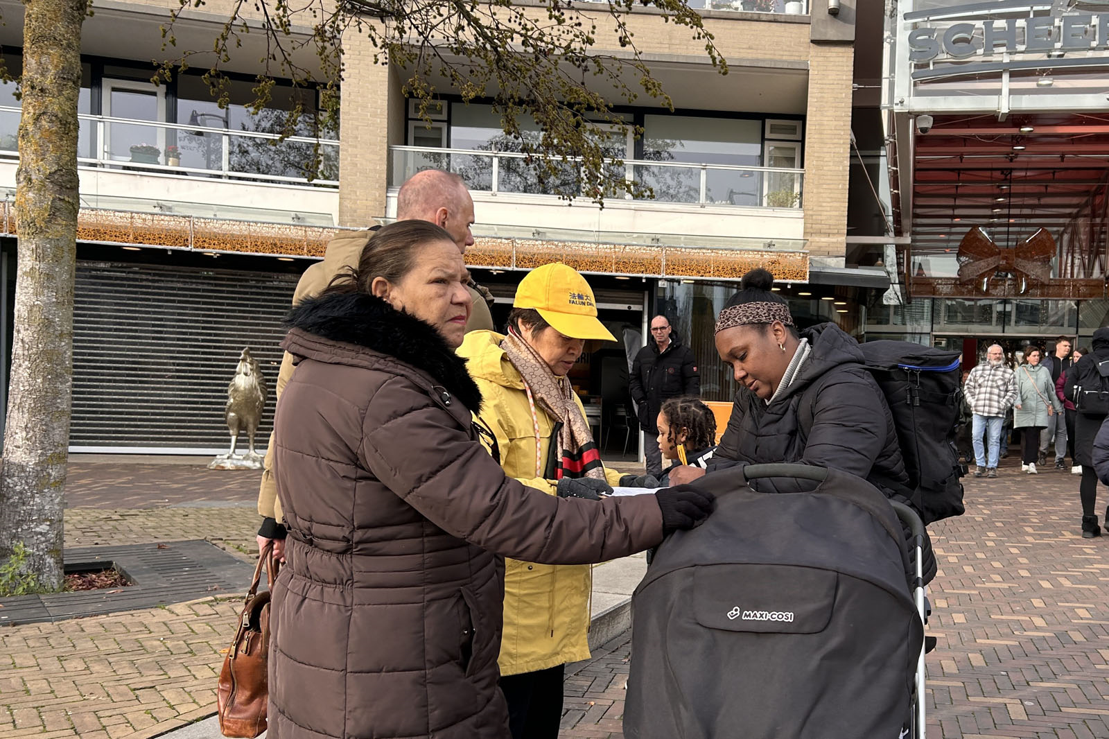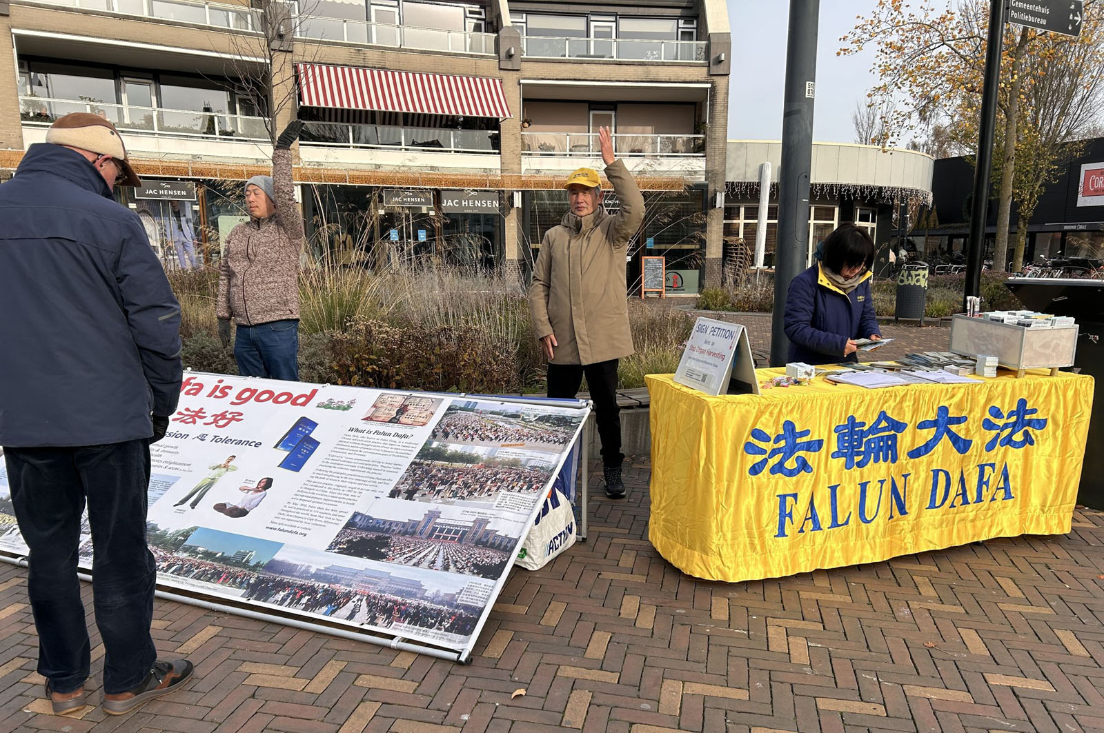 二十二日中午,法輪功學員們在費嫩達爾的高街(Hoogstraat)布置法輪功真相展板,演示法輪功五套功法,向路人發送傳單,講述法輪功在中國遭遇中共長達二十六年的迫害。人們在反對中共活摘法輪功學員器官的徵簽表上簽名,支持法輪功反迫害。