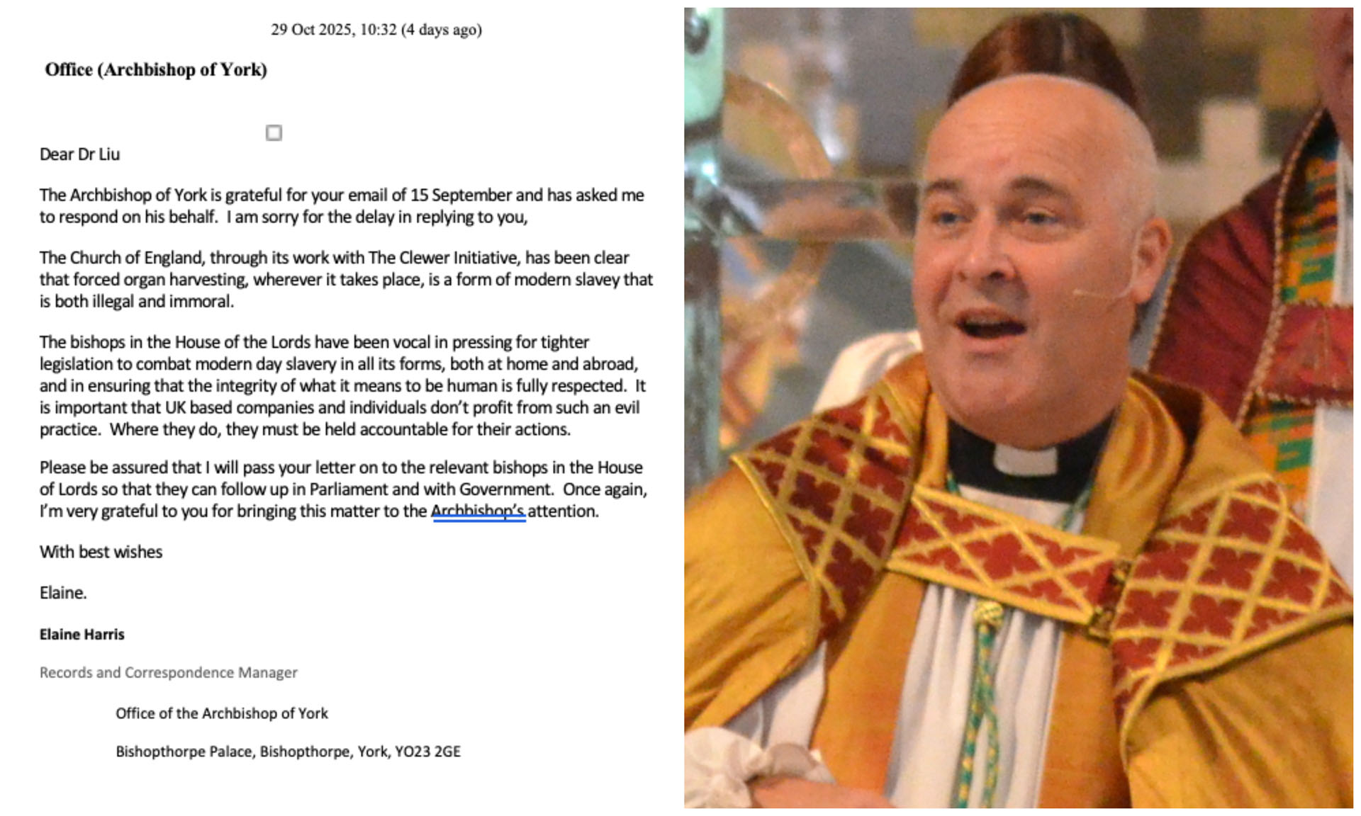 英格蘭教會約克大主教通過其辦公室郵件表示:「英國國教會(The Church of England)通過與克魯爾倡議(The Clewer Initiative)的合作,已經明確表示:強制摘取器官──無論發生在何處──都是一種現代奴役形式,既非法又不道德。」