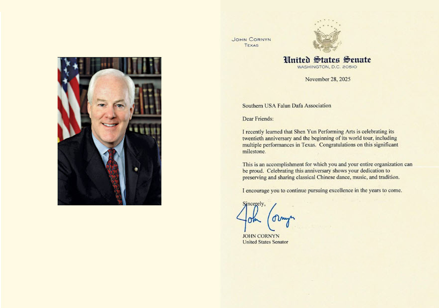 科寧參議員在信中說:「我於近日得知,神韻藝術團正在慶祝成立二十週年,並即將開啟全球巡迴演出,其中包括在德克薩斯州進行的多場演出。對於這一重要的里程碑,我對此表示祝賀。」