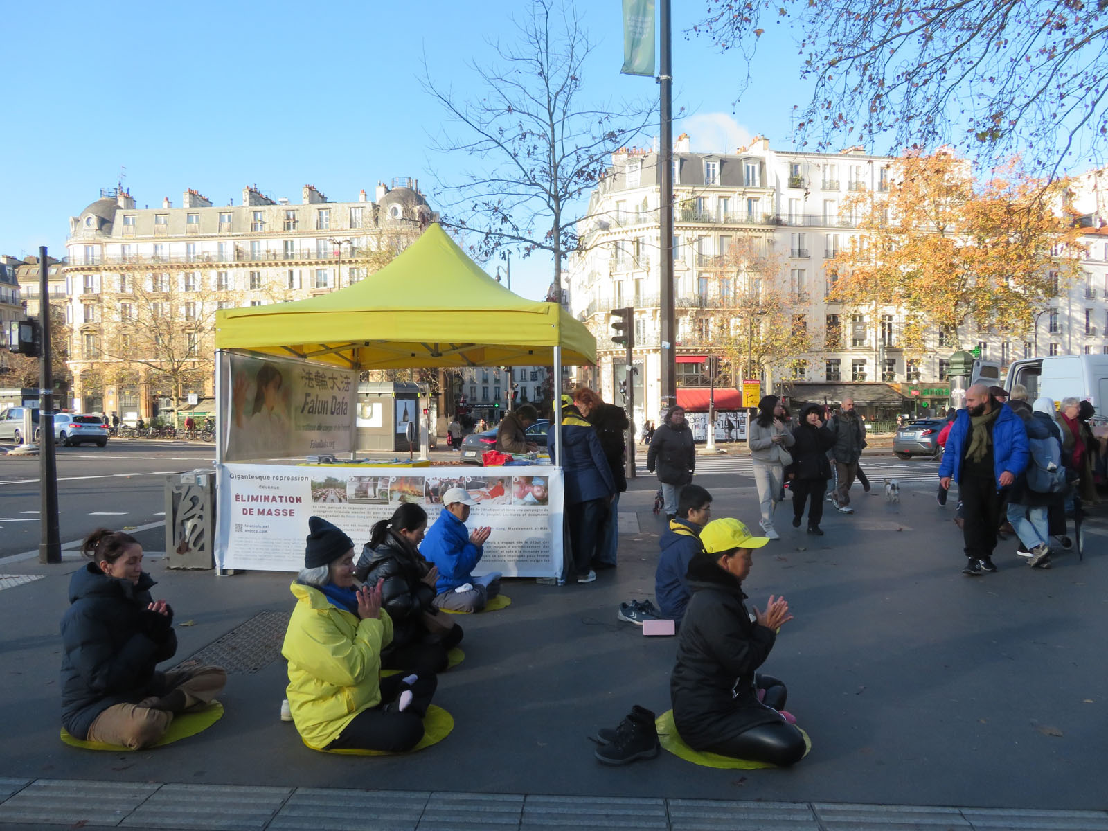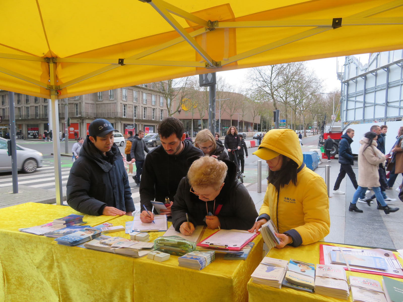 二零二五年十一月二十九日星期六,在南特市埃呂斯廣場(Place de l』écluse),法國西部地區的法輪功學員設立了展台,向路人介紹法輪功及在中共對法輪功學員的迫害。