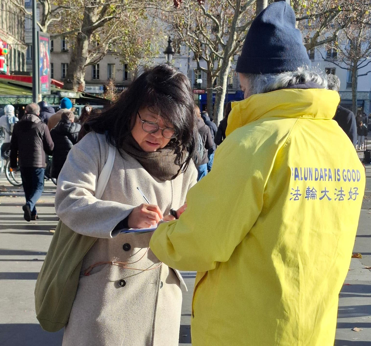 一位法國海軍退役軍人觀看展板時,他認為這些事情發生在遠離法國的地方,應該先解決法國國內的問題。法輪功學員在向他講清真相後,他內心深受觸動,在請願書上簽了名。