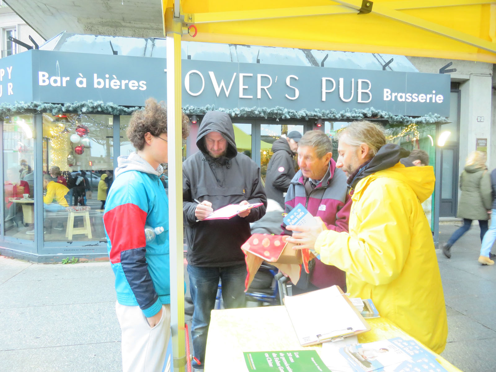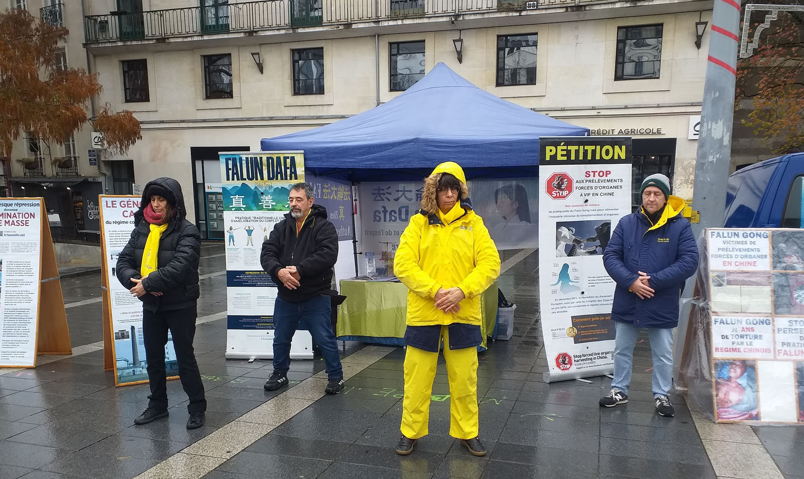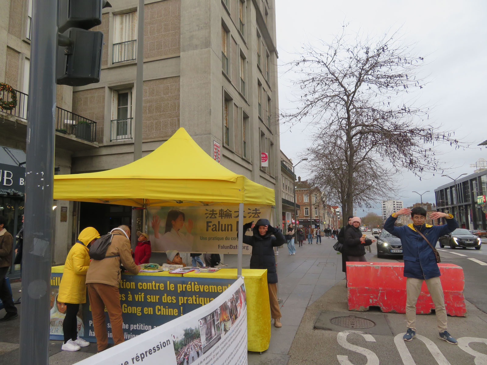 十一月二十九日下午,在亞棉的阿爾方斯﹒菲凱廣場(Place Alphonse Fiquet)廣場,法輪功學員進行了講真相和徵簽活動。正趕上這裏的聖誕市場開啟,來往的行人很多。儘管下著小雨,人們認真傾聽法輪功學員的講解,幾乎所有聽到真相的人都在反活摘徵簽表上簽字,希望停止迫害。