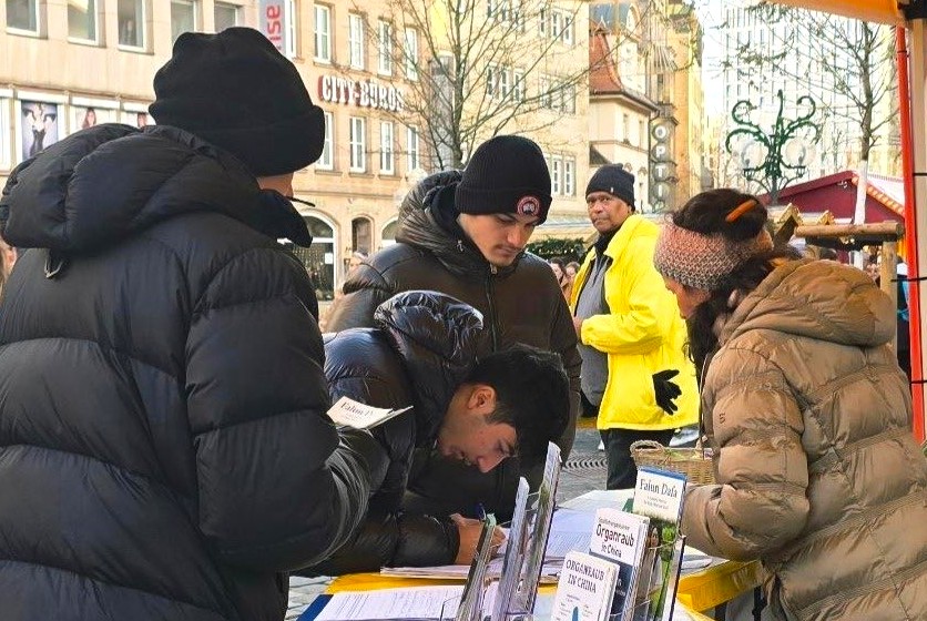 【明慧網二零二五年十二月二十七日】二零二五年十二月二十日,德國紐倫堡的法輪功學員在市中心聖誕市場守夜,展現法輪大法的美好並揭露中共持續迫害法輪功的罪行。路人多次表示,讓大家了解這些真相真好,法輪功學員做的是一項很有意義的事情。