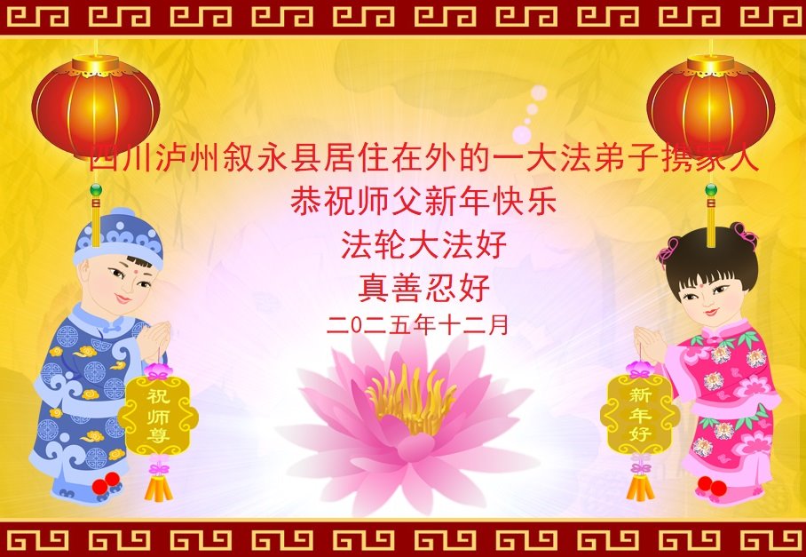 四川瀘州敘永縣居住在外的一大法弟子攜家人恭祝師父新年快樂!