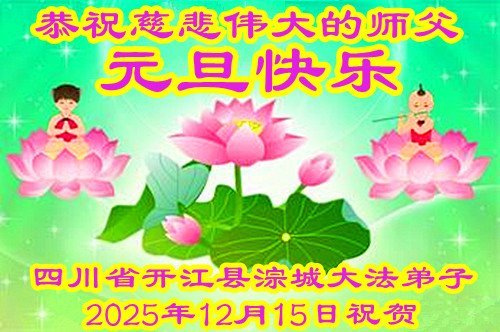 無量慈悲偉大的師尊:您好!您辛苦啦!新的一年到來之際,南充全體大法弟子們合十恭祝師尊元旦快樂!新年好!感恩師尊慈悲保護與救度!弟子們會繼續整體配合,學好法的基礎上,做好三件事,多救世人,不負師恩。