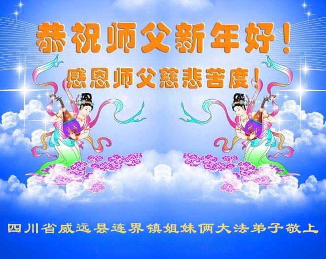 四川省內江市威遠縣連界鎮一姐妹倆大法弟子恭祝師父新年好!