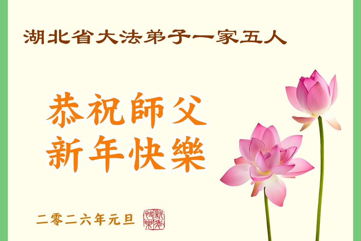 湖北省大法弟子一家五人恭祝師父新年快樂!