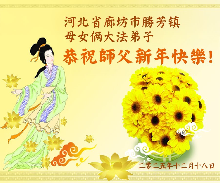 【明慧網二零二五年十二月二十九日】(明慧網通訊員綜合報導)二零二六年新年的鐘聲即將敲響,在中國大陸從事各行業工作的大法弟子們敬祝慈悲偉大的師尊新年好!在師尊的看護下,大法弟子們又走過了在工作和生活中隨時隨處講真相、證實法的一年。在輝煌的新紀元正在開啟的歷史時刻,弟子們會珍惜每一天、每一時刻,謹遵師命,修好自己,多救眾生!