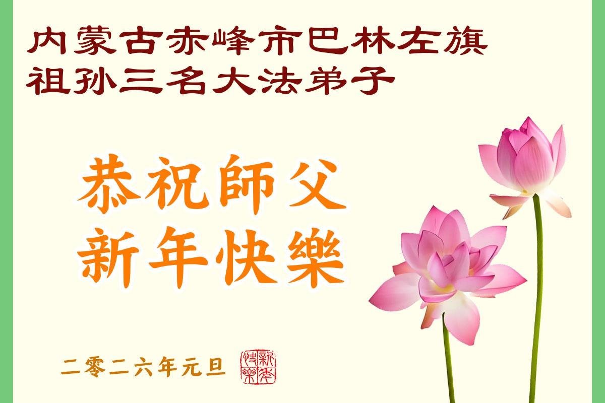 內蒙古赤峰市巴林左旗一大法弟子攜兒子一家五口、女兒一家三口,恭祝慈悲偉大的師尊元旦快樂!