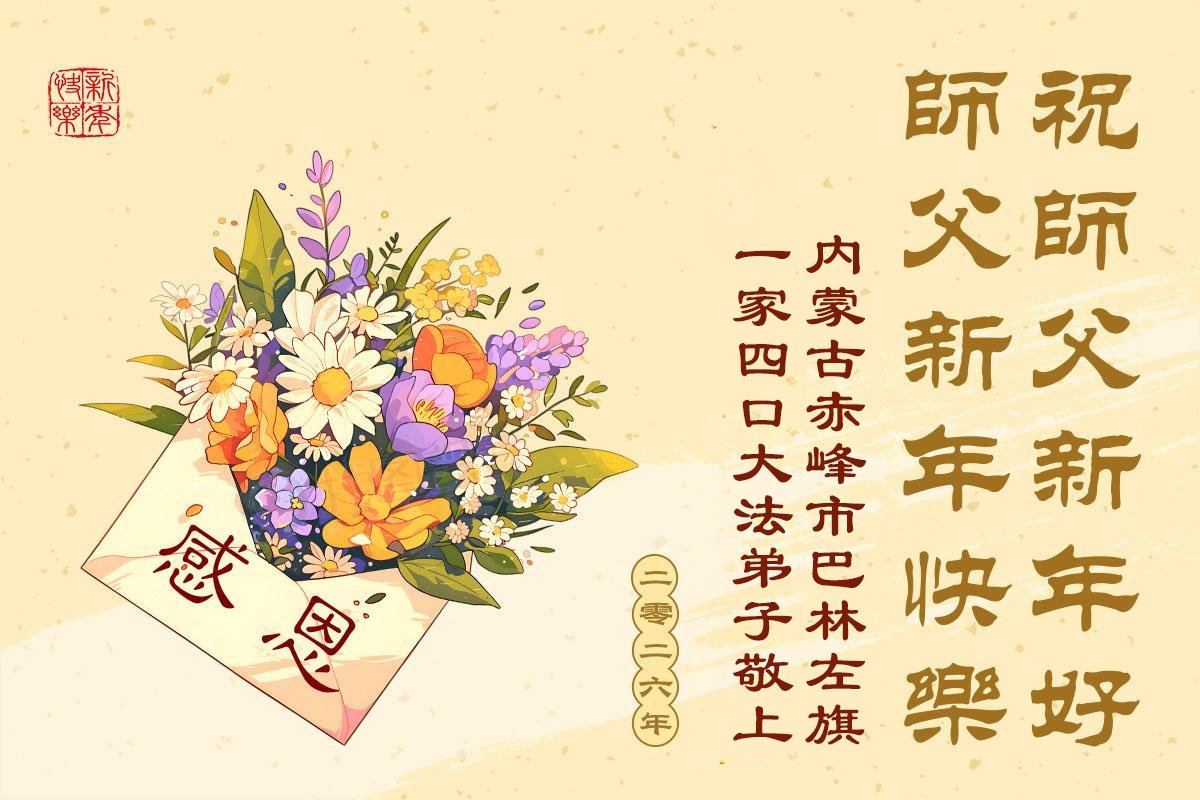 恭祝師尊新年快樂!弟子牢記師尊教誨,在修好自己的同時做好三件事。抓緊講真相,救度更多眾生,讓師尊多一點欣慰,跪拜恩師!
