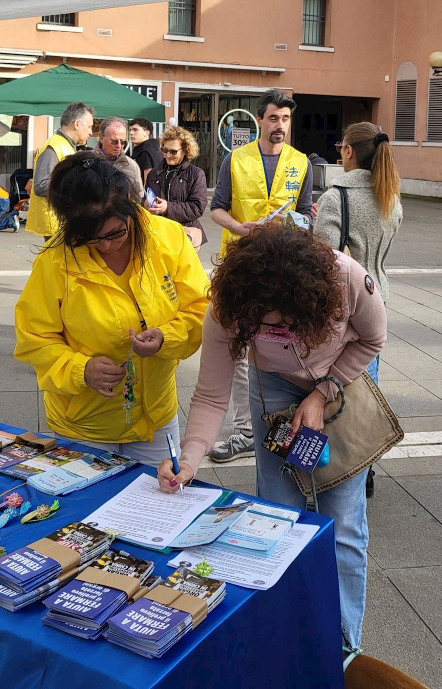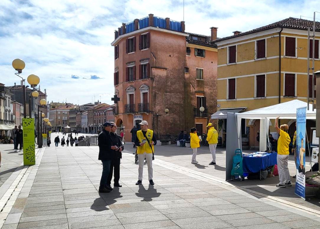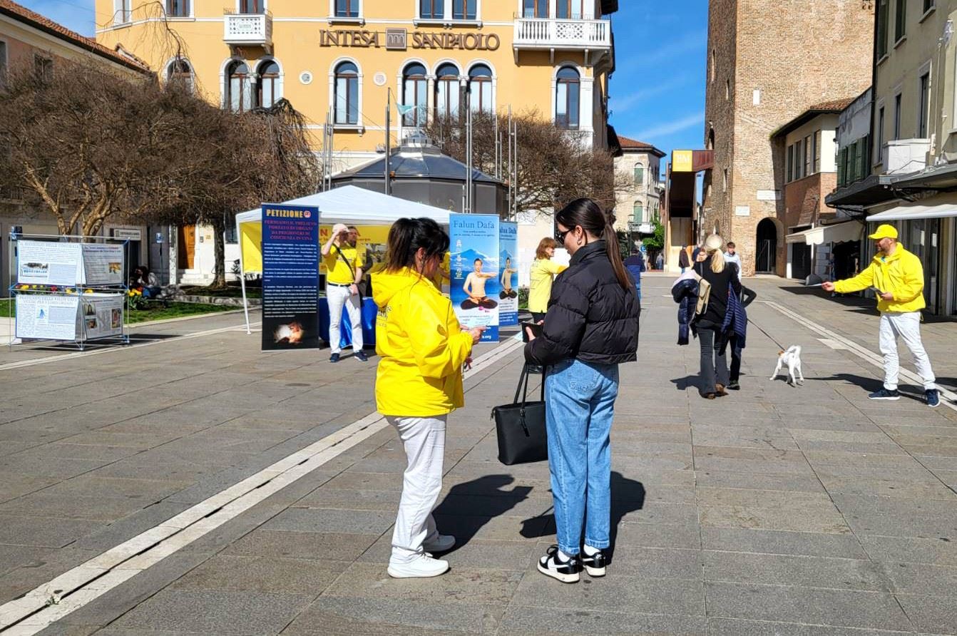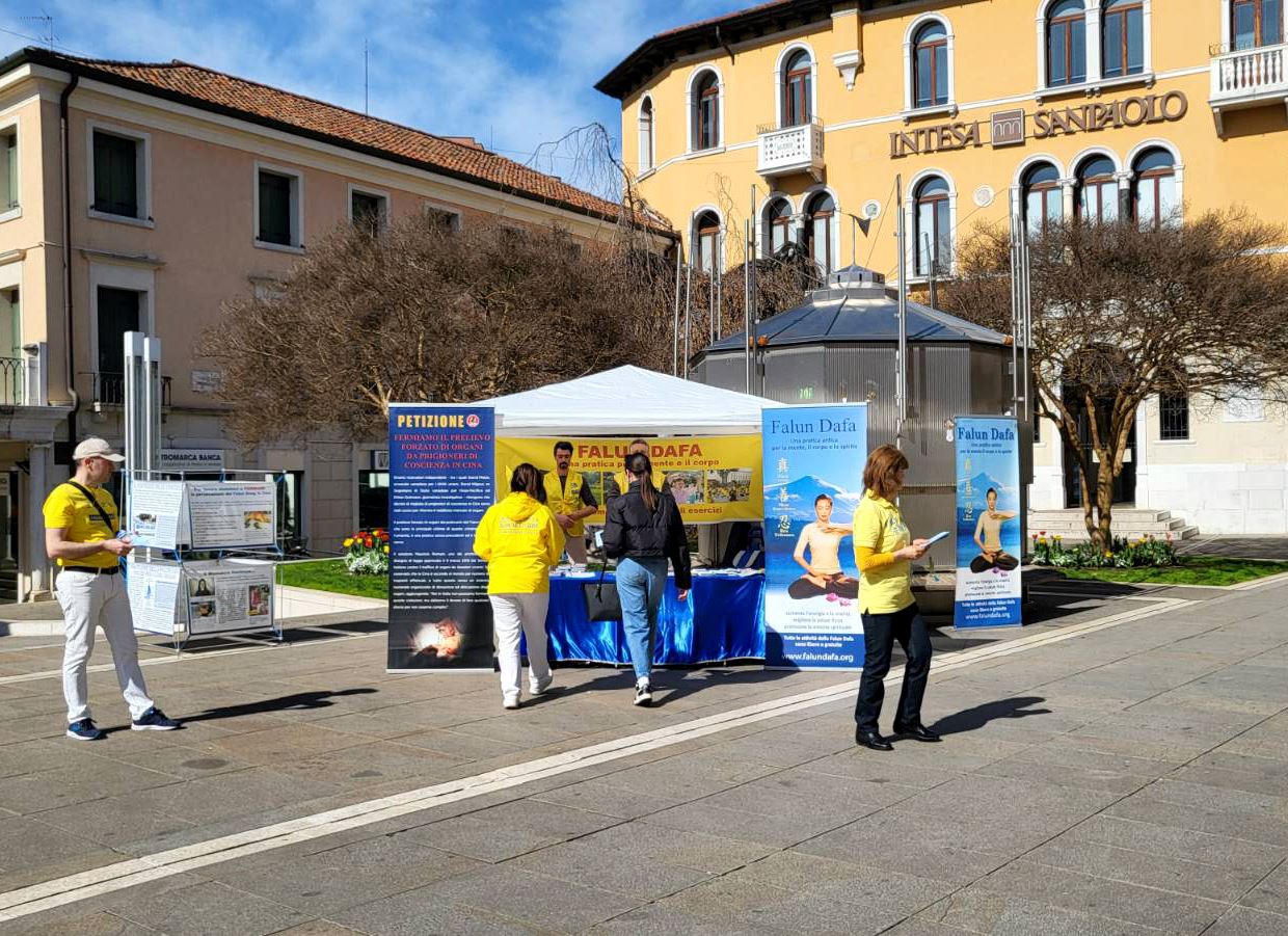 三月二十九日星期六,法輪功學員在威尼托大區梅斯特雷城(Mestre)市中心,馬泰拉廣場(Piazza Mattera)舉辦弘法講真相活動。梅斯特雷(Mestre)是意大利舉世聞名的水城威尼斯的衛星城市。