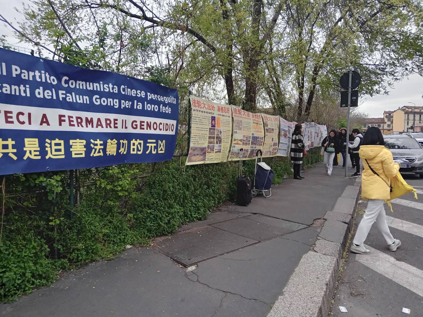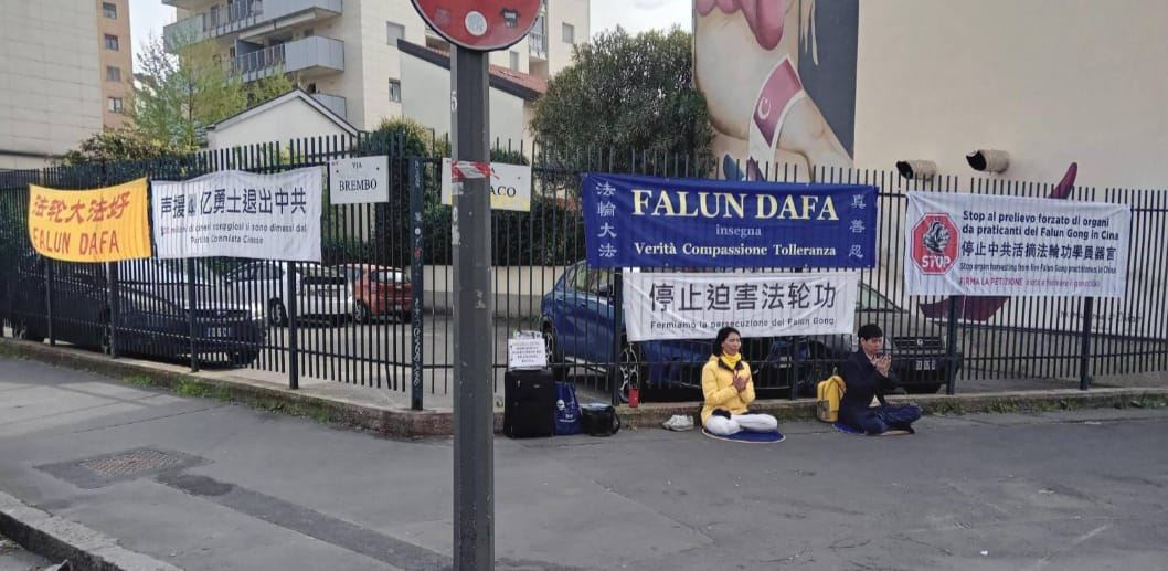 四月二日和九日兩天,米蘭法輪功學員在米蘭中領館前舉行活動,呼籲停止這場在中國持續了二十五年的迫害。他們設立了中文信息板,幫助路過的中國人了解真相。其中有用中文和意大利文寫的橫幅:「法輪大法教導真善忍」「停止迫害法輪功」「停止活摘法輪功學員器官」