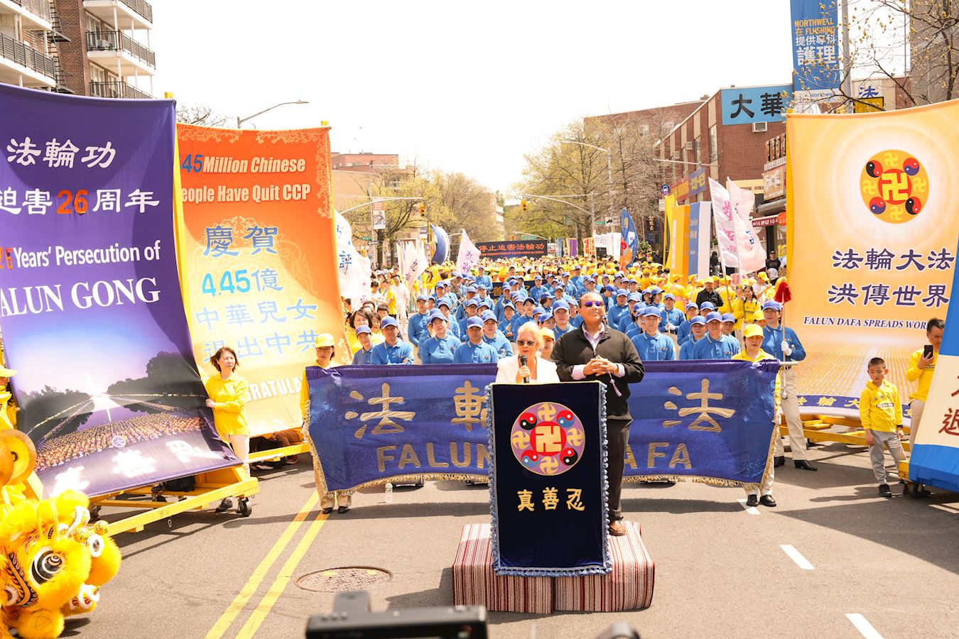 集會當天,凱辛娜大道(Kissena Blvd.)兩旁展幅林立,旌旗飄揚,鼓聲陣陣。集會現場充滿慈悲祥和的強大能量,吸引了眾多路人駐足觀看。很多人紛紛表達對法輪功和退出中共的支持,有的當即要求加入「三退」隊伍。