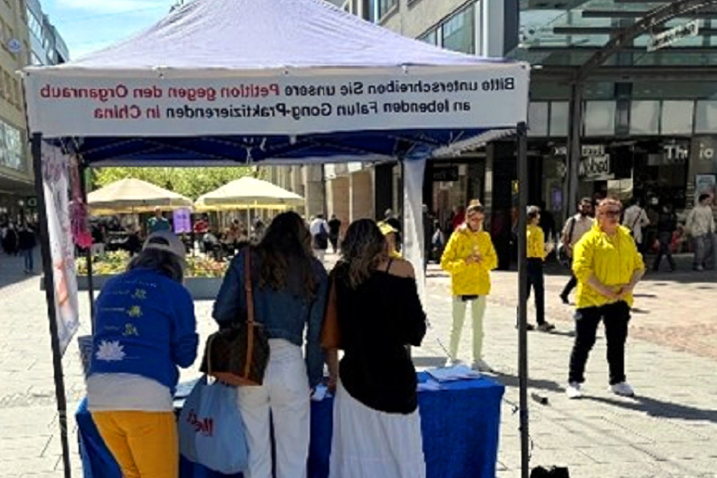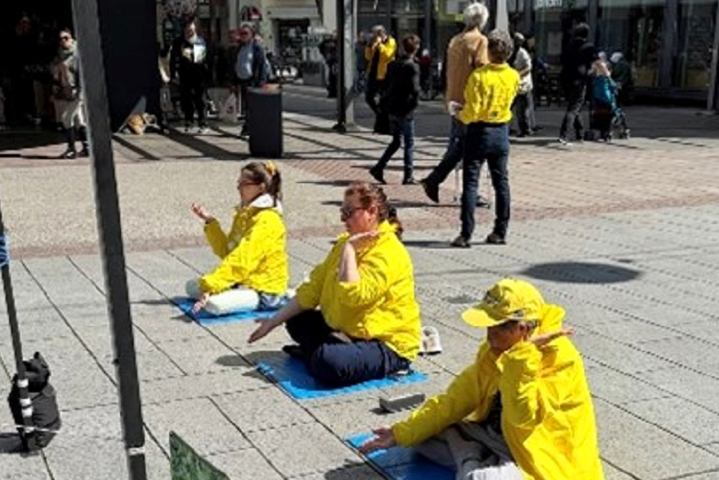 當天,陽光明媚人流如織,許多人都在城市裏活動。法輪功真相信息台前,一部份學員向市民演示法輪大法的五套功法,一部份學員向路人發放真相資料,跟他們講述法輪大法的美好,同時揭露中共慘無人道的活摘法輪功學員器官的罪行。