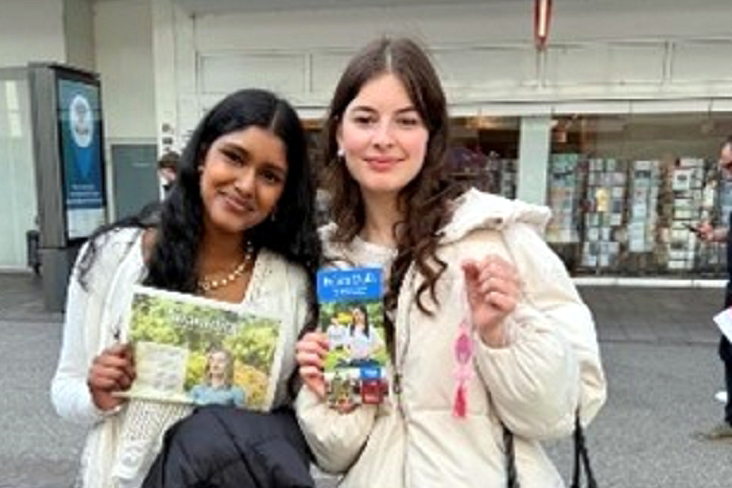 兩位年輕女士認真傾聽學員介紹大法的法理和中國法輪功學員受到中共迫害的真相,離開時她們向學員拿取了真相資料。一位年輕男子也深入了解了大法,並強調他支持對所有人都一視同仁,無論他們的信仰如何。他們三人都高興地在請願書上簽了名。