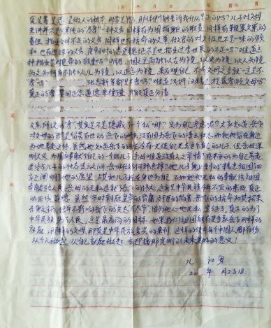 「兒子對父母來講並不是只(有)單純的盡孝一種義務,同樣有為國捐軀的職責,同樣有指出父母不足的義務,同樣也有抗命的義舉,做官的對上級也不是一味的順和,也有進諫的義務,唐朝的忠臣魏徵不是也指出過李世民的不足嗎?一國之主尚能以古為鏡,以史為鏡,以人為鏡,為父為何就不能以兒為鏡,以正念為鏡,來反觀自己,不聽父母之言就一定是不『孝』嗎?真正的『孝』用正念道德來衡量,才能真正分清。父親所說的『孝』,是不是隱藏了一個『私』哪?只為自己考慮呢?岳飛對父母的『孝』是流芳百世的,岳飛的母親沒有因為岳飛的凌雲壯志而把他留在身邊,為她養老送終,雖然她知道岳飛的壯志會有一天使自己失去這個兒子,但岳母深明大義,為國家奉獻了自己的一個好兒子,她(在)兒子身上刺的『精忠報國』四字闡明了她的願望,岳母的無私造就了岳飛的偉大,這就是中華民族千年不滅的東西,真正的正統道德。雖然當時朝廷皇帝的昏庸,奸臣的陷害,岳飛的抗命為其招來殺身之禍,但並不影響岳飛的『矢志』與『盡節』,因為他心底無私,堂堂正正,真正的為了中華民族為了人民,這是最高尚的目標。如果我們祖國能有更多像岳飛那樣的家庭,那樣的父母,那中華民族的復興就能來到。這樣的使命每個中國人都有份,從個人做起,從自己家庭做起,去迎接那光明美好的未來!」