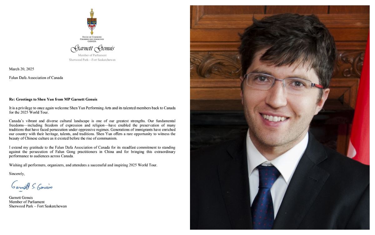 加拿大聯邦國會議員吉尼斯(Garnett Genuis)在賀信中寫道,「一代又一代的移民以他們的(文化)遺產、才華和傳統豐富了我們的國家。神韻提供了一個難得的機會,讓我們目睹共產主義興起之前的中國文化之美。」