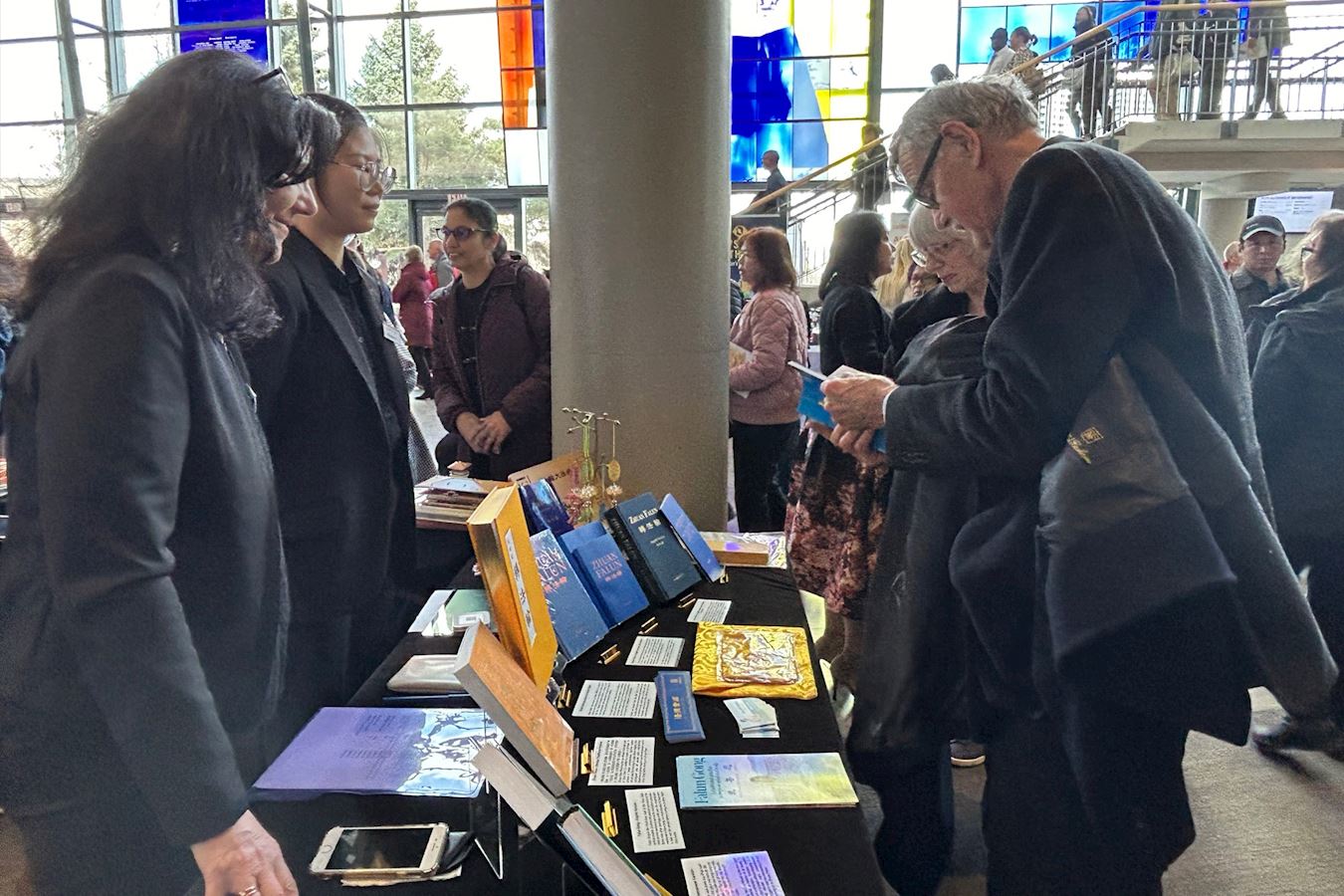 ![]() 圖6:二零二五年三月二十六日晚,美國一家公司的財務總監達倫﹒史密斯(Darren Smith) 和太太觀賞了在夏安市的神韻演出。中場休息期間,他們在法輪大法書籍的展位前排隊準備購買。(大紀元) |