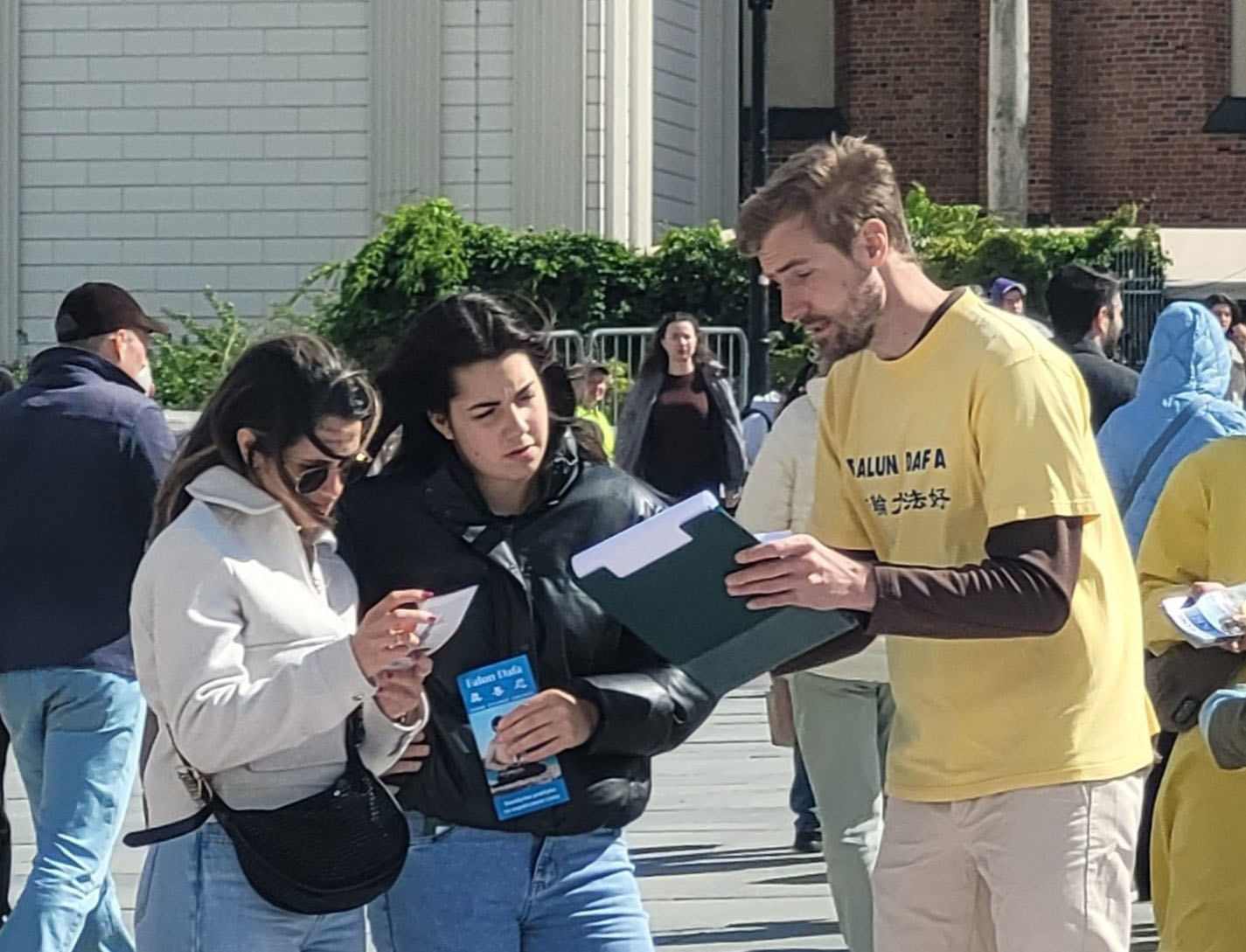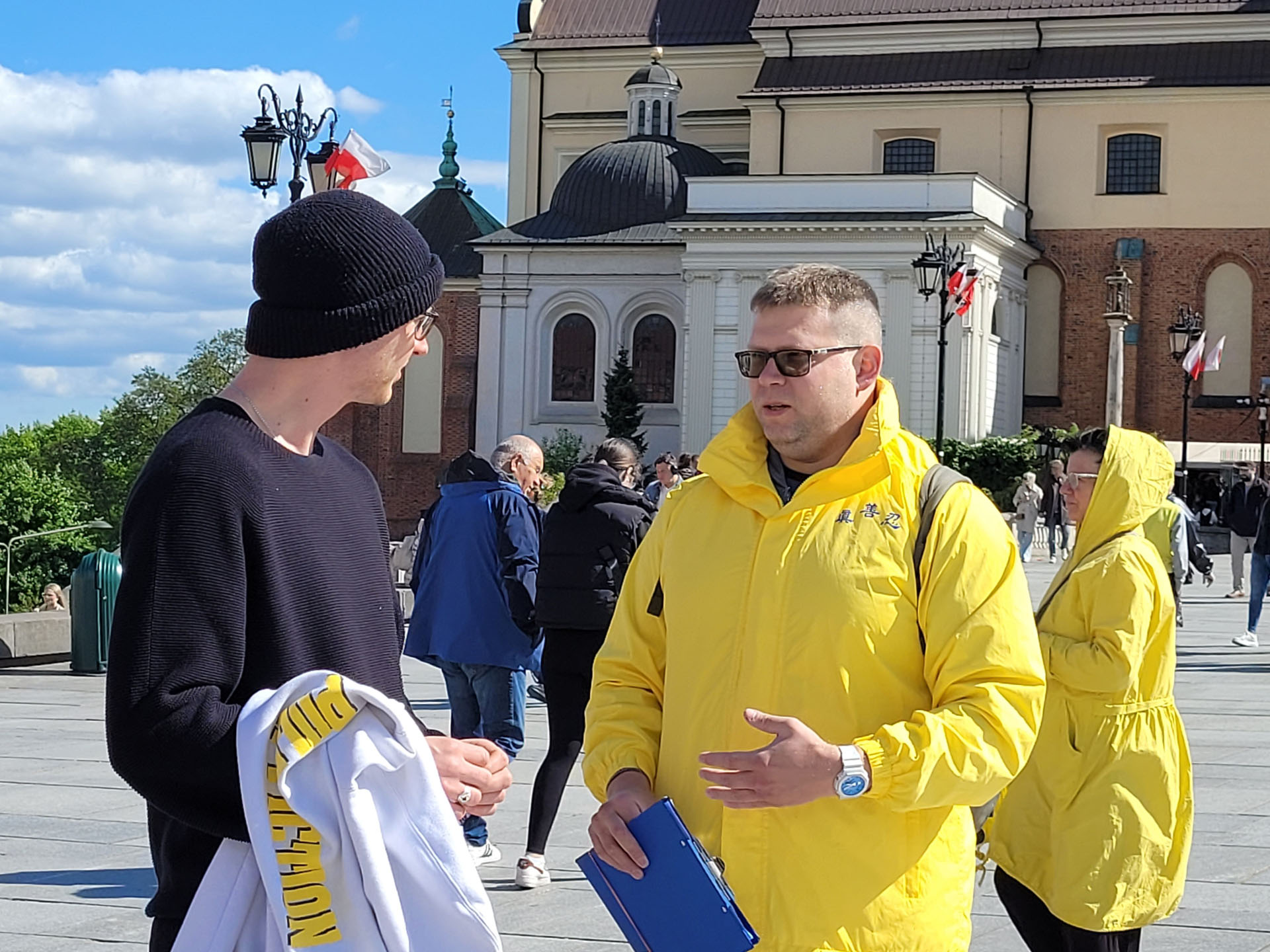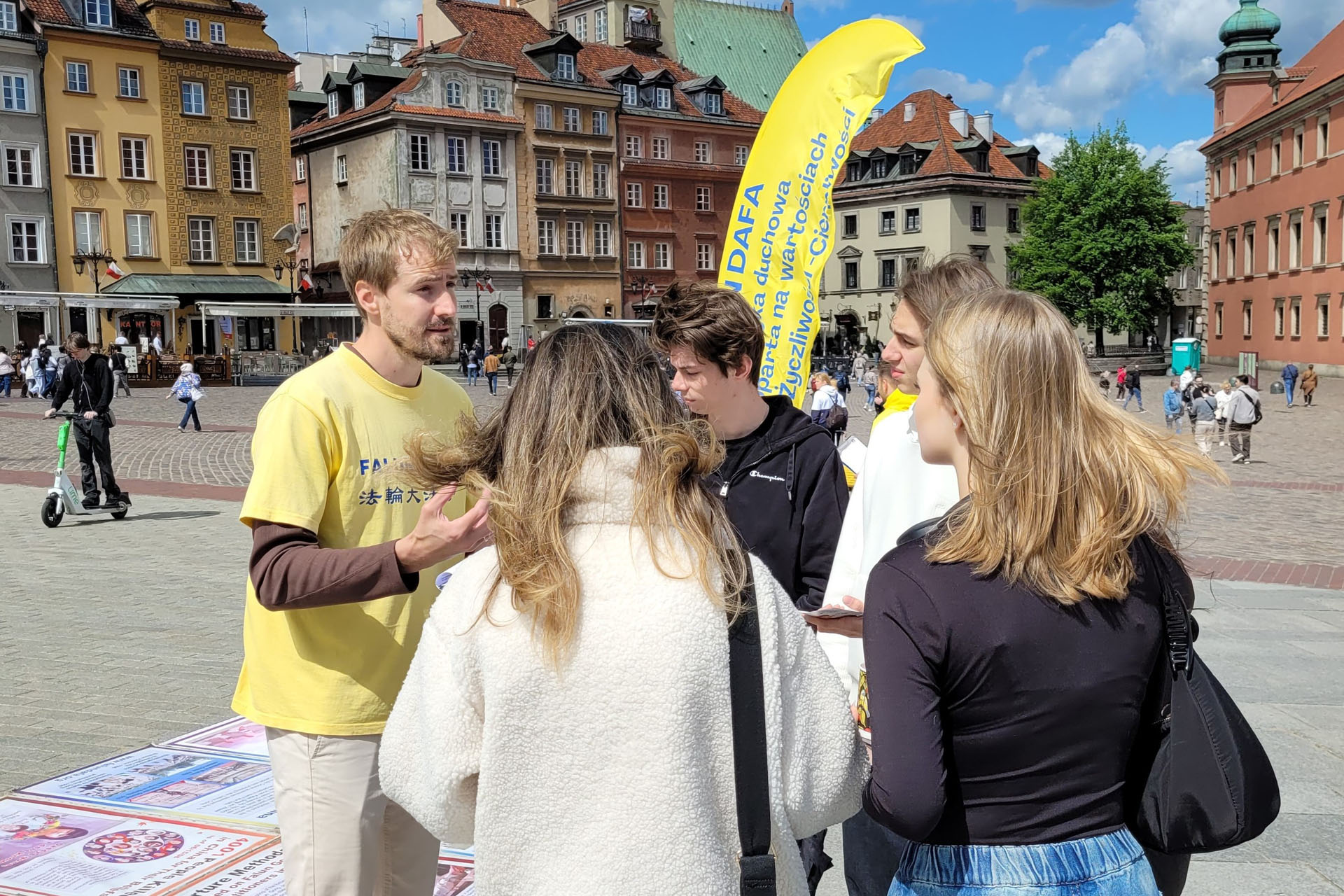 ![]() 圖14:波蘭法輪功學員托梅克(右)在和遊客講真相。 |