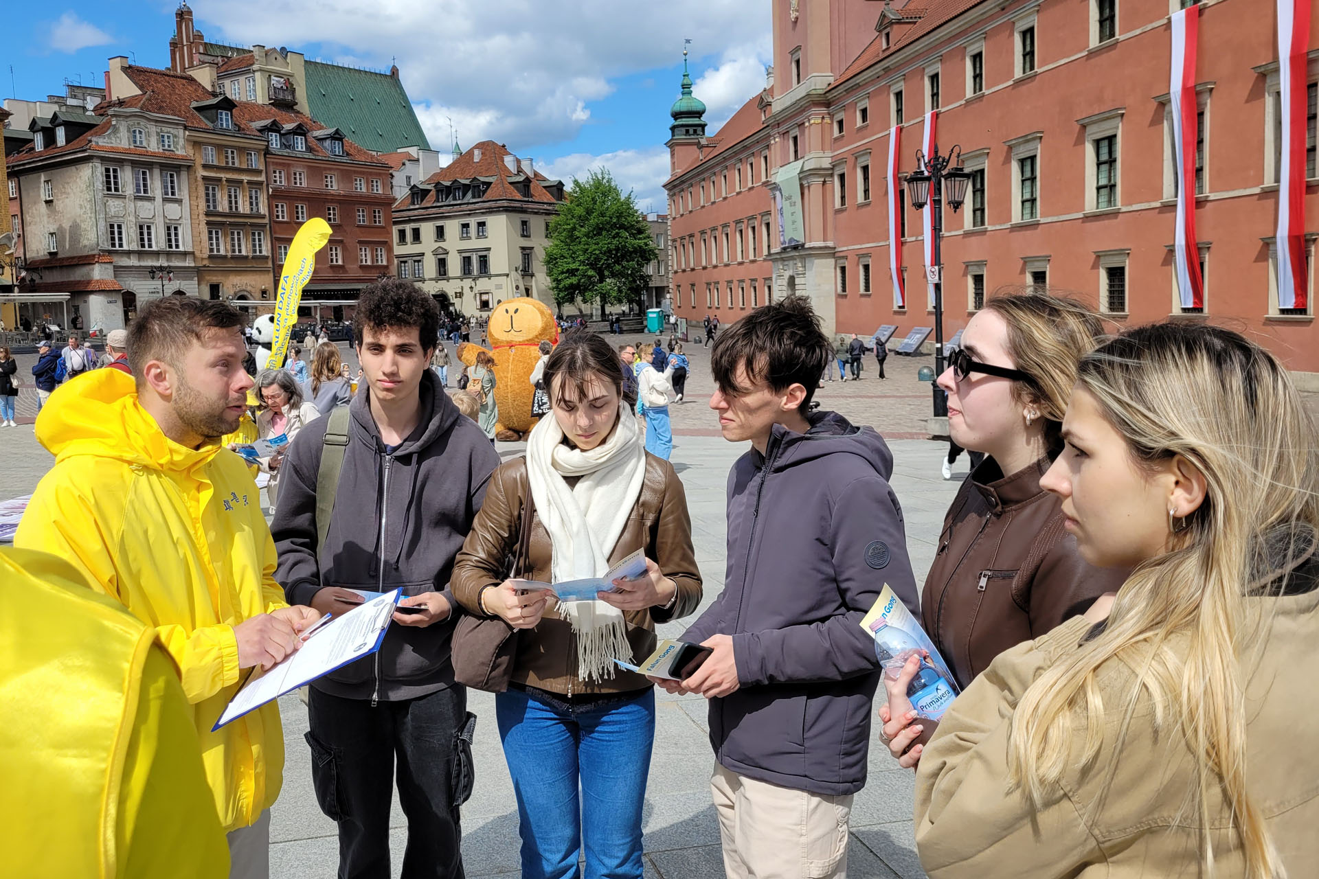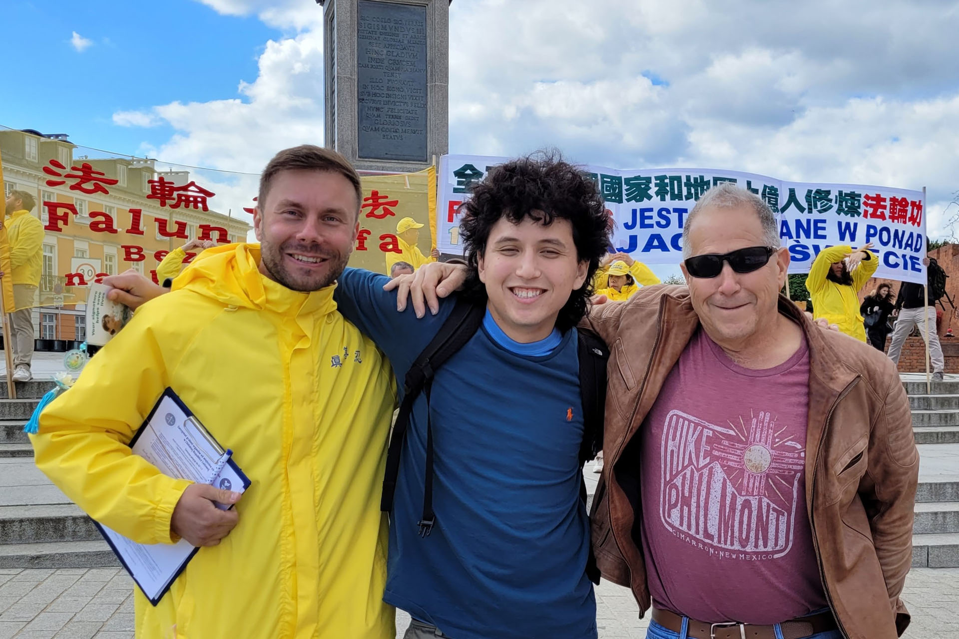 來華沙旅遊的一對美國的父子邁克爾﹒艾森伯格(Michael Eisenberg)與父親馬龍﹒艾森伯格(Marlon Eisenberg)先生在古城廣場上第一次看到法輪功功法的展示,心中升起溫暖親切與祥和的感覺。當看到法輪功真相展板上的內容時又感到非常吃驚,強烈的對比,使父子兩人難以相信當今世界上還有如此暴行,他們站在人群中認真聽著法輪功學員的述說,不僅雙雙參加了反迫害的徵簽,還都對法輪功產生了濃厚的興趣。