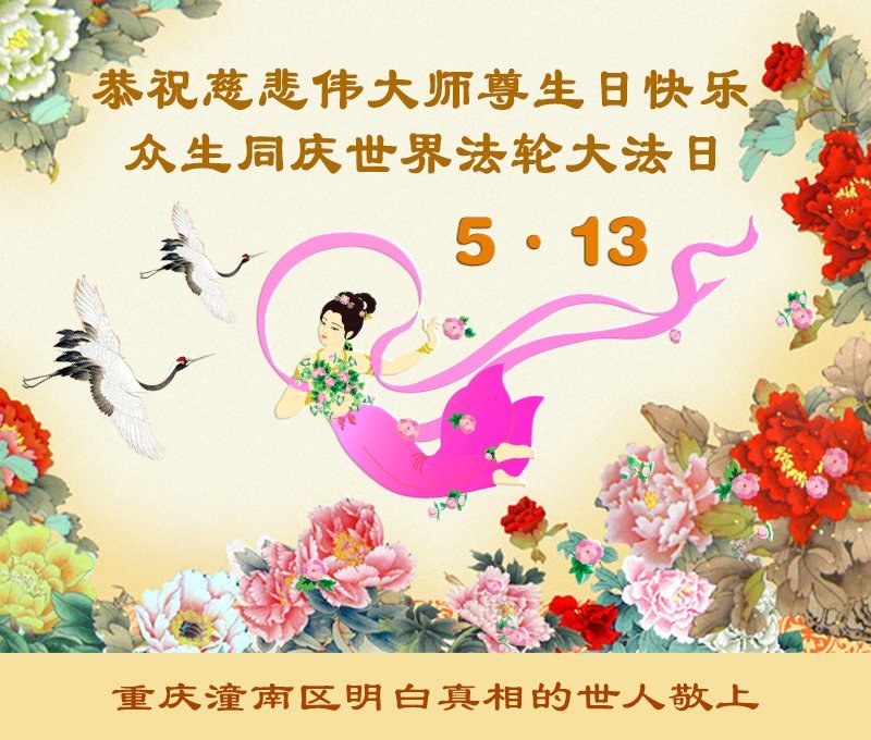 在這普天同慶「五•一三」的幸福日子,恭祝師父生日快樂!感謝您給我們帶來了無限的希冀和尊崇的信仰,是您讓我們看到,面對人間慘惡時,不是畏縮的絕望,而是一種強烈的想讓更多人明白真理真相、跟隨法輪大法前進步伐的仁者胸懷,願每一個生命都能早日回歸正道。
