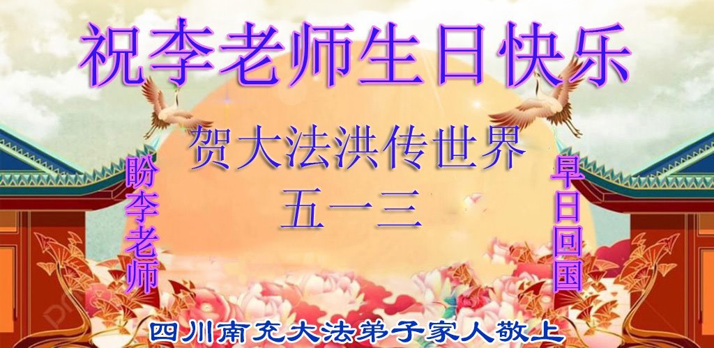 尊敬的李老師:您好!今年5.13在您生日來臨之際,我和我的家人祝您生日快樂!感謝您的慈悲救度!讓我和家人受益多多,您傳的大法,雖然我未修煉,但大法的洪大,通過我父母們的修煉,我們也有所感悟,感謝李老師給我們全家帶來的福緣!再次祝李老師生日快樂!盼李老師早日回國!