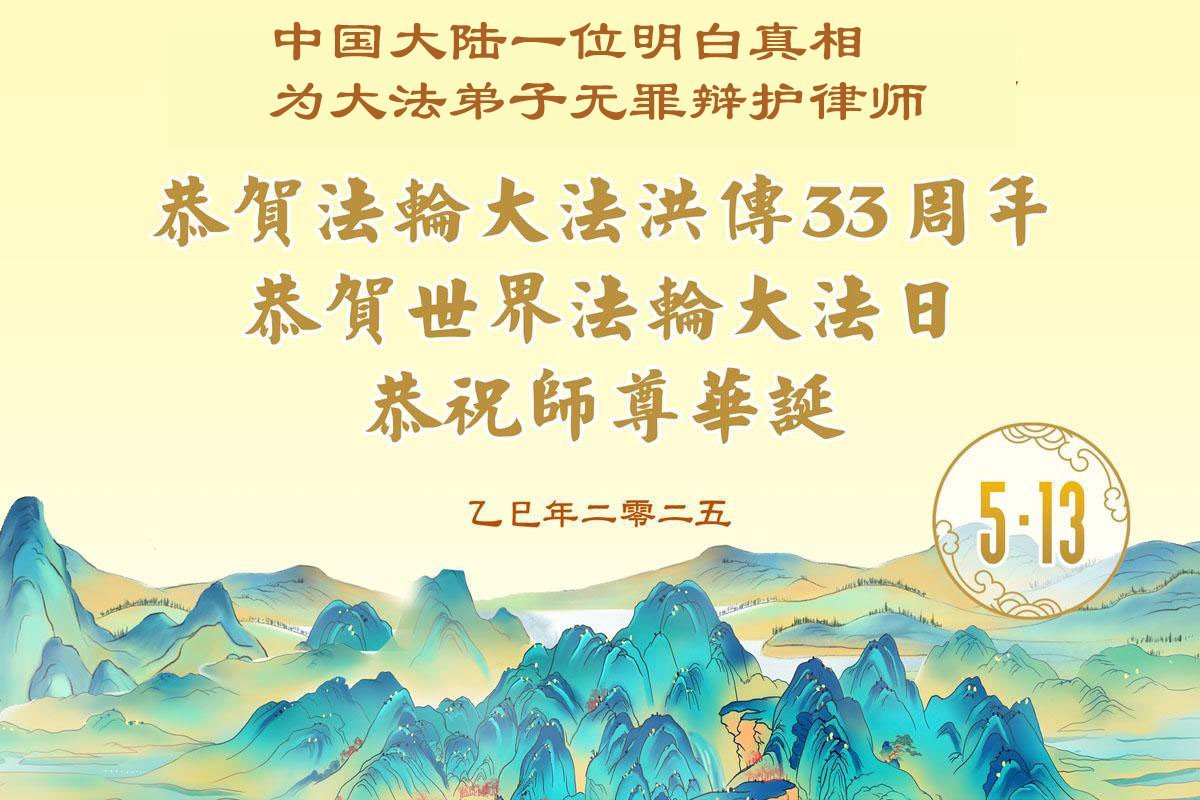 一位為大法弟子做無罪辯護的律師恭賀李大師:「您已經桃李滿天下!您的弟子們在自身遭受磨難中還在慈悲救度眾生的壯舉感動了我!感動了世界!更感動了蒼宇!他們正在鐫刻著一座座歷史的豐碑!正義越來越彰顯出來!我在用心的期待!期待著法正人間那一刻的到來!」