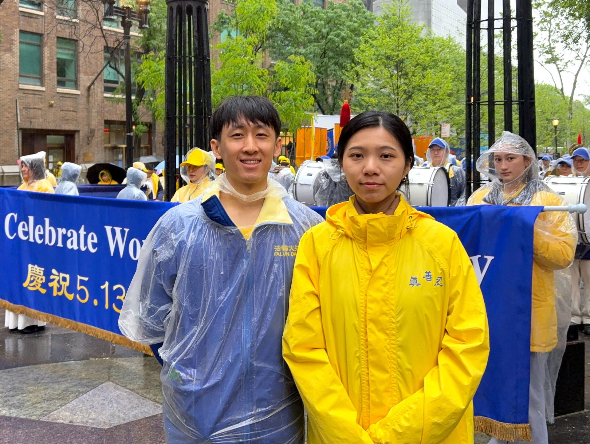 紐約居民薩曼莎(Samantha)在大學工作,多年來都能觀看到法輪功學員的遊行,她感歎遊行隊伍非常壯觀,她說:「我總是會對遊行隊伍的人數之多感到驚嘆!特別是今天下這麼大雨,有這麼多人仍然熱忱地參與這個活動,實在令人感動。」